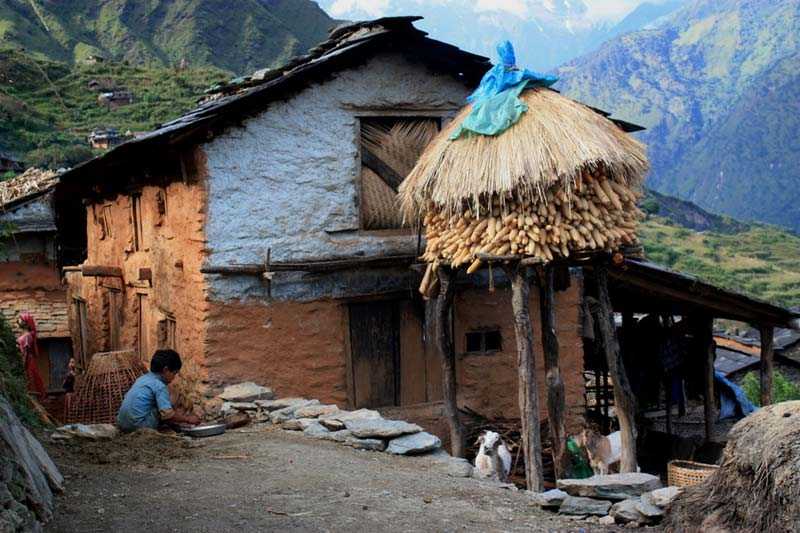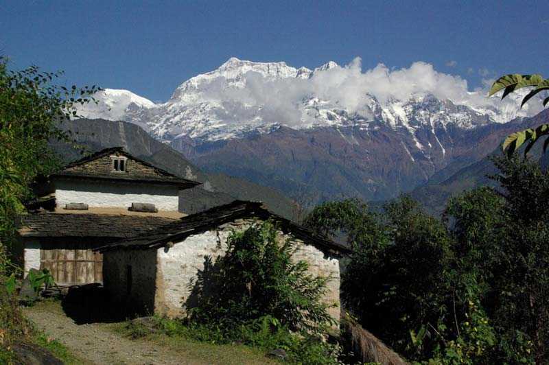 m) haben sich Jirbang (6062 m) und Manapati (6380 m) geschoben. Bei Muna überqueren wir auf einer hölzernen Hängebrücke den Dhara Khola mit dem weiter oben liegendem gleichnamigen Ort, von dem wir den Übernachtungsort Muri (1850 m) erreichen. Sein Kennzeichen sind die mit dünnem schwarzen Schiefer gedeckten Häuser der Magar. Da auf dem Schulplatz bereits die vier Franzosen zelten, nehmen wir weiter oben den freien Platz an einer Stupa, so sind wir aber auch etwas weg von den vielen Kindern des Ortes. Abends wird es wolkig, auch die Berge sind in Watte gepackt. Ich lade Phadindra zu einem Bier ein, am Hauptplatz von Muri an der Telefonstelle genehmigen sich einige unsere Gruppe eines des für uns Deutsche ach so bedeutsamen und lebenswichtigen Getränks. 160 Rupees kostet es nach einigem Verhandeln, die Cola 60 Rupees. Das halbe Dorf sieht uns dabei zu, alle haben ihren Spaß. Ganesh kauft, tötet und schlachtet einen jungen Wasserbüffel. Mit Ralf sitze ich im finsteren Küchenzelt und wir sehen zu, wie das arme Tier in mundgerechte Stücke zerlegt wird. Unsere fleißigen Küchenleute haben alle Hände voll zu tun, sie waschen, sortieren, zerkleinern, hacken, schneiden, häckseln und müssen in der Dunkelheit sehr auf ihre Finger aufpassen. Das Fleisch wird einige Tage reichen für alle. Zum Abendessen gibt es gebratenen Büffel mit Reis, Kartoffeln und Gemüse, zum Nachtisch Kompott. + 675/ - 425 m in 7 Std. (2 Std. Pause)