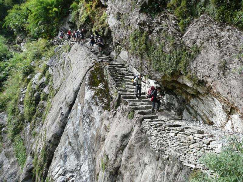 drauf. Die vor den Hütten sitzenden Träger haben Pilze gesammelt, die sie sich zu ihrem Reis braten. Unser 5-Sterne-Küchenteam wirtschaftet unermüdlich Tag und Nacht, um 23 verwöhnte europäische Mägen satt zu bekommen, was ihm aber vortrefflich gelingt. Das verrenkte Bein eines Porters wird von Erik wieder gesund massiert. Auch die Franzosen sind wieder hier. An Bergen sehen wir links den Malbas (4625 m), gerade über dem Korabantal den Konabon Peak und den Myagumath, zwei Sechstausender, rechts den Jirbang und den Manapati, ebenfalls Sechstausender, links dahinter spitzt der Dhaulagiri hervor. Ich bekam 2006 von Sanga einige nepalesische Begriffe erläutert: Namlo ist das Stirnband der Träger, Khakon der Basket oder Tragkorb. Tokhma, der T-förmige Stock dient zum Absetzen der Traglast. Unsere Leki-Stöcke sorgen bei Nepalesen für Heiterkeit, da leki = ficken heißt. Der englische Mädchenname Laura (gesprochen Lora) bedeutet Penis. Bier könnte man hier für angeblich 350 Rupees kaufen, was uns aber doch zu teuer ist. Warum müssen eigentlich die Deutschen immer so viel Bier in sich reinschütten? 18 Uhr 15 wird es dunkel, der Himmel über dem Platz ist jetzt leuchtend blau, an den Bergen kleben kleine Wolken, ansonsten ist es wieder wolkenlos. Die märchenhafte Umgebung des Camps regt meine Phantasie zum Träumen an. An den umgestürzten, von Moos überwucherten Bäumen hängt prosaisch unsere Wäsche zum Trocknen, was in diesem feuchten Regenwald nicht gelingen dürfte, da mit Einbruch der Dunkelheit sofort der Tau alles überzieht. Ich hole sie nachts lieber ins Zelt. Das Abendessen ist der krönende Abschluss eines jeden Tages. Heute gibt es Tomatensuppe, dazu werden große Teller mit Popcorn gereicht. Große, schwimmend ausgebackene Kartoffeltaschen, außen Kartoffelteig, innen weichgekochte Kartoffeln mit ein wenig Gemüse, scharf gewürzt, schließen sich an. Spaghetti mit einer dicken Tomatensoße, dazu geriebener Käse und kleine Wasserbüffelsteaks, geschmort mit gedünstetem Paprika und Tomaten bilden die Hauptspeise. Anschließend Pizza mit Gemüse, Thunfisch und Käse überbacken. Zum Nachtisch bekommen wir einen leckeren süßen Kürbiskuchen mit geflochtenen Teigstreifen. Trinken kann man heiße Milch mit Ovomaltine, Kakao oder Kaffee, schwarzen, Jasmin- oder Pfefferminztee. Die Köche sind unübertrefflich, stammen sie doch aus der Lehre von Meisterkoch Ganesh. Abends werden auch die Trinkflaschen für den nächsten Wandertag mit abgekochtem Wasser gefüllt. Wer möchte, bekommt als Betthupferl eine heiße Gummiwärmflasche für seinen Schlafsack. Mit dicken Bäuchen kriechen wir mühsam unseren Zelten zu. Vorher nochmal pullern gehen ist Pflicht, nützt aber nicht viel, da man spätestens nach einer Stunde wieder vors Zelt treten muss. Wir trinken sehr viel, um der Höhenkrankheit vorzubeugen. Ich verkrieche mich jetzt in meinen Schlafsack, ohne Schwächelflasche, dafür eingewickelt in Nirus rotgeblümte Baumwollhülle. Das Kopfkissen und die beiden ebenfalls von Niru gestellten Isomatten sind warm und weich. Gute Nacht allerseits, schlaft gut, ab morgen abend pfeift es aus einem anderen Loch. + 955/ - 550 m in 7:30 Std. (2 Std. Pause) |