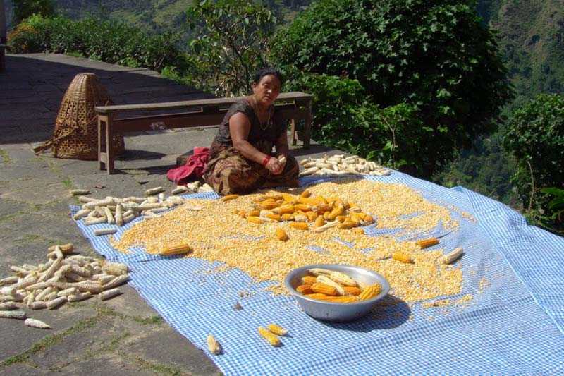 Hirsefeldern säumen den Weg. Auf 1200 m Höhe überqueren wir die Eisenbrücke des grauen Modi Khola, der direkt aus dem Annapurna South Base Camp kommt. Auf breiten Steintreppen keuchen wir schweißtreibend wieder hinauf nach Landruk, die Häuser sind anders als in Ghandruk, einfacher und ärmlicher, es gibt Restaurants und Lodges. Am Ortsende steht eine kleine von Wasser angetriebene Getreidemühle: Wir beobachten, wie eine hübsche Frau ihren Mais mahlt. Durch eine kluge Vorrichtung rieseln die einzelnen Körner langsam in die Öffnung des schnell rotierenden Mühlsteins, werden durch die Fliehkraft nach außen transportiert, dabei zwischen den Steinen zerrieben und landen schließlich außen als fertiges Mehl, das zusammengefegt und eingesackt wird. Ralf gibt ihren drei Kindern seine drei letzten Ricolabonbons, diese wiederum bieten uns eine Art frische grüne Schoten an, die einheimische nepalesische Schokolade, wie Hems sarkastisch bemerkt. Auf dem linken Hang geht es auf gleicher Höhe flussabwärts, auf der anderen Seite bleibt weit oberhalb Ghandruk zurück. Die Berge sind in Wolken, aber bei uns herrscht Sonnenschein, es ist sehr warm, ich laufe mit Sandalen und kurzen Hosen. Vorbei an einzelnen Gehöften und abgeernteten Reisfeldern, deren Garben ausgerichtet liegen, sie müssen noch eine Woche trocknen, dann werden die Reiskörner ausgeschlagen, entkörnt. Die neuen Reissetzlinge werden aus Körnern herangezogen und im Frühjahr oder Sommer zu zweien oder dreien in den nassen Boden gesteckt. Tolka erreichen wir nach 4:40 Std. in 1860 m Höhe. Wir haben jetzt Hunger, im Hof des Sunny Guesthouse essen wir Mittag, Hash Brown Potatoes, gebratene rohe grob geriebene Kartoffeln mit Rührei, trinken süßen Zitronensaft und schwarzen Tee. Die Besitzer sind sehr freundlich, sogar einige deutsche Wörter kennen sie. Nach 1 ½ Std. Pause weiter leicht bergauf durch den Ort und vorbei an Feldern. Für einen Schulneubau schreiben wir uns in ein Buch ein, spenden etwas Geld. Ebenfalls einem jungen Mann mit verkrüppelten Beinen, er war als Träger unterwegs, als ihn eine Steinlawine verschüttet hat und er drei Tage lang eingeklemmt war. Dann steigt der Weg an, vor uns eine dicke hohe grüne Wand von Bäumen, wir umlaufen ein Flusstal, überqueren die hölzerne Hängbrücke, wechseln auf die rechte Seite, erreichen in kurzem Anstieg das Örtchen Bheri Kharka. Ein Apfel kostet hier 40 Rupees, da kriegt man in Marpha mehrere Kilo davon. Unterwegs in den Urwaldbäumen wieder Affen, auch eine schwarze, ein Meter lange Giftschlange sehen wir am Wegesrand. Es geht hinauf im grünen Dschungel zum Bhickok Deurali Pass (2100 m). Wir sitzen in der Trekkers Inn Lodge und trinken ein Everest-Bier auf die Tatsache, dass es unser letzter Anstieg heute und überhaupt dieses Jahr in Nepal war. Spruch von Uwe: die Männer am Gipfel, die Frauen im Tal – oben die Freiheit, unten die Qual. Wir sind glücklich. Die Hessen am Nachbartisch schauen finster und verbissen, beißen fast den Henkel ihres Bierglases ab. Leute, entspannt euch, ihr seid in Nepal und nicht beim Schaffe. Allmählich geht es hinab durch dichten Nebel und umgestürzte Bäume, Pokhara und die Umgebung ist leider nicht mehr zu sehen, alles unter Wolken. Nach 45 Minuten erreichen wir Pothana (1900 m) um ¾ sechs kurz vor Sonnenuntergang. Der Ort besteht nur aus Touristen-Lodges, wir müssen unsere Permits erneut von der A.C.A.P. abstempeln und unsere Daten in ein dickes Buch einschreiben lassen. Es beginnt zu regnen, erst leicht, dann so richtig monsunmäßig in Strömen. Ade schöner Aussichtszeltplatz. Unsere beiden Begleiter Yogesh und Hems kommen triefend mit unserem Gepäck angehechelt. Wir beschließen, heute noch einmal in einer Lodge zu horsten. Im gegenüber liegenden Heaven´s Gate Guest House bekommen wir ein einfaches sauberes Dreibettzimmer im ersten Stock. Es kostet 250 Rupees, also 0,80 € pro Nase. Zum gemeinsamen Abendbrot gibt es Daal Bhaat, das scharf gewürzte nepalesische Hauptgericht, dazu eine große Kanne Tee. Die kommende Nacht ist schon wieder sternenklar. + 1020/ - 1065 m in 9:45 Std. (2 Std. Pause) |