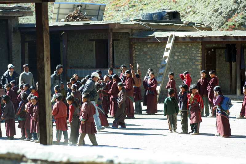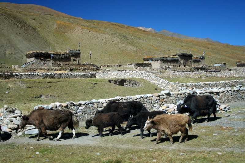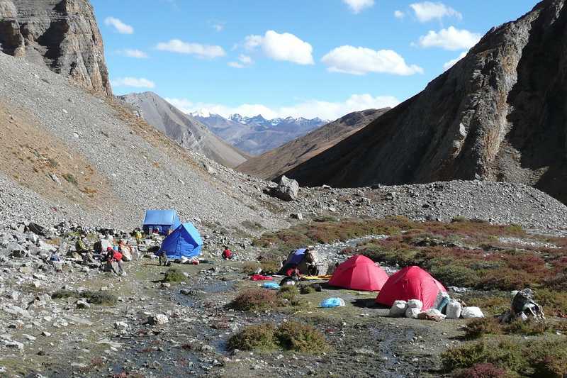 03. 10. 2010 Sind von nun an eine kleine Trekkinggruppe von 5 Touristen sowie 9 nepalesischen Begleitern. Es geht über den Thakchiu Fluss hinauf nach Tungyalaphu Odar, wo sich Chhoila Khola und Jyanla Khola vereinen. Wir gehen letzteres Tal flussauf in nordwestliche Richtung. Uns kommen Trekker entgegen, eine Frau sitzt auf einem Pferd, 150 US$ kostet der Luxus pro Tag, ein kostspieliges Vergnügen. Später treffen wir den 60-jährigen Günther, der die Schule in Saldang sponsort, er hat sich kurzerhand gleich ein Pferd gekauft für 120.000 Rupees, reitet damit den kompletten Dolpo-Treck. Am Ende wird er es verkaufen und den Erlös für die Schule verwenden. Ca. 200 m links über dem Fluss verläuft unser allmählich aufwärts führender schmaler Pfad. Uns wehen eiskalte Windböen entgegen. 15 Uhr erreichen wir auf 4615 m unseren heutigen malerischen Zeltplatz Murjung auf einer 60 m hohen Moräne in einem windgeschützten Tal mit kleinen Bächen, von hohen Felsen und steilen Felsschutt-Halden umgeben. Rückblickend sehen wir unten im Tal um die schneebedeckten hohen weißen Berge dicke Wolken aufziehen. Unser Lager wird eingerichtet, alle Zelte aufgebaut und eingeräumt, 2 Isomatten, darauf das Baumwoll-Inlet und das Kopfkissen. Wir helfen manchmal dabei mit. Unser Muli-Mann sattelt seine Tiere ab, bringt sie auf die steilen Weiden in einem fernen nicht sichtbaren Hochtal zum Fressen. Spät am Abend wird er einen Strick im Boden fixieren und die Mulis über Nacht daran in gleichen Abständen an den Beinen festmachen. Kurz darauf verschwindet die Sonne hinter den hohen Berghängen für heute. Kälte macht sich breit. Aber nicht für lange, dann ist Teatime, wir bekommen heißen Tee, heißes Wasser für Kaffee oder Tee und heiße Milch für den Kakao, dazu Kekse. Gute Zeit, den Tag Revue passieren zu lassen, sich Notizen zu machen, in der Karte den Tagesverlauf nachzuvollziehen und schon mal auf den morgigen Weg zu schauen. + 635 / - 90 m in 6:15 Std. (2 Std.Pause) |