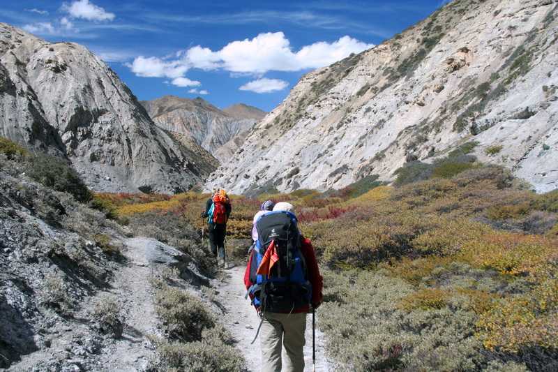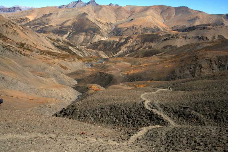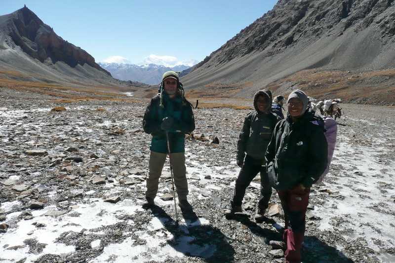 04. 10. 2010 Die Kücheneinrichtung kommt in die Baskets der Küchenhelfer, schwere Sachen auf die Muli-Rücken. Karki Takuri hat früh schwer zu tun, allen das Tragegeschirr aufzulegen und festzuschnallen, was nämlich einigen der Tiere absolut nicht gefällt und sie dann auch ausschlagen, er muss vorsichtig sein. Auch unsere beiden Träger Kami und Utra packen ihr oder besser unser Zeug zusammen und sich auf den Rücken. Vor dem Gehen löschen sie gründlich das Feuer, an dem sie abends das Essen gekocht, das Wasser erhitzt und früh sich gewärmt haben. Vor uns liegt ein Aufstieg von 600 Metern über unseren ersten Pass, „gehn mer langsam“. Es ist wieder heiß, nur der Wind ist eisig, man muss höllisch aufpassen, sich nicht zu erkälten. In Serpentinen geht es eine steile Schuttmoräne hoch, dann auf feuchter brauner Erde, wo vor kurzem noch Schnee lag. Wir merken die Höhe bei jedem Schritt. Wir sehen kurz vor dem Pass links den Dhaulagiri I und II, den Sita Chuchura, den Hongde Peak und den Tukuche Peak. In 4900 m kommen wir auf eine Hochalm, ein High Camp, zum übernachten geeignet. Weiter oben pfeift uns der orkanartige eisige Wind um die Ohren, von der Sonne merken wir nichts, Schritt für Schritt quälen wir uns hoch. Einatmen, ausatmen. Es gibt nur noch Steine, gefrorenes Geröll und mickriges braunes Moos, dass aber von unseren Maultieren gern gefressen wird. Die spärlich rinnenden Bäche sind halbgefroren. In der Ferne blinkt ein kleiner Bergsee. Endlich sehen wir die Gebetsfahnen des Passes. 10 Uhr 30 stehen wir oben auf dem 5221 m hohen Pass Jyanta Bhanjyang, wir haben es geschafft, gratulieren und drücken uns gegenseitig. Wir legen einen Stein auf die Gipfelpyramide und befestigen die mitgebrachte Gebetsfahnenkette daran und an einer weiteren Holzstange. Hoffen, dass deren vom Wind fortgetragenen Gebete uns auch weiterhin alles Gute bringen werden. Im Windschatten geht es auf der anderen Seite steil hinunter. Zum Glück liegt kein Schnee, das hätte schwierig werden können. Unter uns liegt ein herrliches braunes Tal, man sieht den winzigen Weg weit, weit unten, glaubt in Tibet zu sein, was ja auch gleich hinter den nächsten Bergen liegt. Phadindra sagt, dass das nepalesische Königreich Mustang genauso aussieht wie diese Gegend hier, nur ist es etwas flacher mit mehr Dörfern. Weiter unten dann Bewuchs mit Wacholderbüschen und einigen innen zartgrün sprießenden und außen schwarzgefrorenen Brennesselstauden. Das nördliche Tal liegt eindeutig wärmer als die Südseite. Kurz unterhalb des Passes ein weiteres kleines High Camp. 500 m steigen wir ab zu dem am rechten Ufer gelegenen weiträumigen Weideplatz Chang La Phedi mit den langen Steinmauern, gesammeltem Brennholz und riesigen Mengen an Yakdung, das auch entsprechend duftet. Wir machen eine Pause am schwarz aussehenden Flüsschen. Normal wäre hier unser Camp, wir beschließen aber, noch ein Stück weiter zu einer besseren und geruchlosen Stelle zu gehen. Bald danach kommt von rechts ein Fluss aus einem wunderschönen Tal, Phadindra, unser Guide überlegt kurz, er war nur einmal hier gewesen und das war vor ca. 11 Jahren. Kurzer Blick auf die Karte, dann weist er die richtige Richtung nach Norden flussabwärts über eine Brücke ans linke Ufer ins malerisch gelegene Dachun Khola. In diesem Tal wachsen mannshohe grüne, gelbe und rote stachelige Büsche, es ist schwer, einen Weg hindurch zu finden, meist mogeln wir uns seitlich an den steilen Felshängen entlang. Die meisten Handlungsreisenden nach Saldang laufen über den Phoksundo See, nicht diesen, unseren schwierigeren Weg. Unterhalb einiger Nomadenzelte, in den Ziegen- und Yakhirten ihren Sommer verbringen und ihre Herden in der Nähe auf die steilen abgelegenen hohen Weiden führen, schlagen wir am rechten Flussufer unser heutiges Lager auf. Laut den Yakhirten heißt der Ort Samdo (4620 m). Die Küche zelebriert uns heißen Tee und eine heiße Maggi-Nudelsuppe, da es heute unterwegs nur packed lunch, also gepacktes Mittagessen gab. Mit Phadindra steige ich hoch zu den Zelten der Nomaden. Wir werden von einigen älteren verrunzelten Frauen in ihr Zelt eingeladen. Später kommt noch ein alter Mann dazu. Alle tragen verdreckte dicke schwarze Kleidung. Gewaschen haben sie sich wahrscheinlich diesen Sommer und Herbst noch nicht. Unterhalten uns mit ihnen, wo sie herkommen und wo wir zu Hause sind. Sie kommen aus der Umgebung von Saldang, wo sie auch den Winter verbringen, Ende Oktober brechen sie hier ihre Zelte ab und kehren mit ihren Herden und deren Produkten nach Saldang in ihr festes Haus heim. Sie backen auf einem winzigen Eisenöfchen Fladenbrote aus Gerstenmehl, die wir mit echter Yakbutter probieren dürfen, dazu Buttertee. Es ist rauchig im Zelt, oben dient eine kleine ovale Öffnung dem Rauchabzug. Fast alle haben Probleme mit den Augen oder den Zähnen. Sie fragen nach Medizin, später bekommen sie von uns Augensalbe im Camp. Davon kann man in Dolpo für die Tibeter nie genug dabei haben. Ich verteile ihnen kleine Geschenke von Kerstin und Uwe wie Stifte und Haargummis, mit denen sofort die grauen fettigen Haare zusammengebunden werden. Phadindra überreicht ihnen zum Schluss noch 100 Rupees. Zurück unten im Lager. Unser Muleman hat starke Kopfschmerzen, ich gebe ihm 2 Aspirin, wir legen ihn auf eine Isomatte ins Speisezelt, decken ihn mit 2 Schlafsäcken zu, bald danach geht es ihm wieder viel besser. + 650 / - 740 m in 6:15 Std. (2 Std. Pause) |