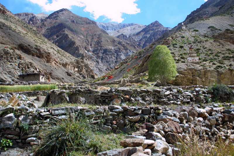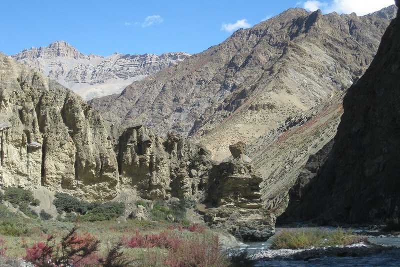 05. 10. 2010 Hier müssen wir den relativ wenig Wasser führenden Fluss durchwaten auf die linke Seite. Eine kleine Holzbrücke bringt uns später wieder ans rechte Ufer. Der gut instandgehaltene Weg führt unterhalb von malerischen gelben Steinsandformationen und roten Büschen entlang. Wir kommen zu einem mauerumgrenzten Dorf mit einigen grünen Gerste- und vertrockneten Kartoffelfeldern, schönen Steingärten und einem einsamen hohen grünen Baum. Hier machen wir unsere Lunchpause. Phadindra und ein Küchenhelfer bauen derweil für uns eine Holzbrücke über den Fluss um, die Brücke wird nicht mehr an ihrem Standort gebraucht, da der Fluss sein Bett verändert hat. Es geht links in Kehren den Hang hoch zu einem schönen Panoramaweg ca. 100 m über dem Tal. Von hier herrliche Aussicht auf die Felsen und Seitentäler, sowie die hohen Berge in Tibet. Der Weg wird breiter, es folgen Terrassenfelder, Mani-Mauern, viele Chörten. Am anderen Ufer rechts ein in die Felsen gebautes Bergkloster. Das ist der malerische Ort Rakyo (4160 m). Im Ort sehen wir mit der Ernte beschäftigte Tibeter, einige Männer bauen ein Haus, die Kinder bekommen Bonbons und Stifte von Robert und Kerstin. Ab hier wird der Panoramaweg breiter. Im nächsten Ort durchlaufen wir eine weißgekalkte, mit rötlichen Punkten und Streifen versehene Tor-Chörten, ich sitze ergriffen davor, bin gerührt und kämpfe mit den Tränen, alles erinnert stark an Tibet und Mustang. Es ist der Ort Namdo oder Chagaon oder Sibu (4100 m). Wir zelten oberhalb der Primary School auf einem Stück abgeerntetem Maisfeld. Hier gibt es 62 tibetische Schüler und 6 tibetische Lehrer, die bis Ende Oktober hier bleiben, dann ein halbes Jahr in den tibetischen Stadtteil Boudhanath nach Kathmandu zurückkehren. Das heißt 6 Monate Ferien für die Kinder, nun, sie werden sich freuen. Allerdings dürfte der lange harte Winter hier oben auch nicht von Pappe sein. Es gibt die Klassenstufen 1 bis 5, in den nepalesisch und tibetisch gelehrt wird, sowie die Klasse 6, die extra noch Englisch unterrichtet bekommt. Der bereits hier in Nepal geborene tibetische Hauptlehrer und dessen Frau, ebenfalls Lehrerin, deren beider Eltern aus Tibet emigriert sind, laden uns in ihre praktisch eingerichtete spartanische Einraumwohnung im Schulgebäude ein. Er zeigt und erklärt uns ein naturkundliches Phänomen und mit Abstand die größte Einnahmequelle der Tibeter. Den tibetischen Raupenpilz Yartsa Gunbu (*3). Er hat einige große dunkelbraune Exemplare da. Auch einer unserer nepalesischen Küchenhelfer zeigt uns davon welche. Mit Robert besichtige ich eine ehemalige Gompa auf der anderen Flussseite, die jetzt aber privat bewohnt wird. Da keiner zu Hause ist, forschen wir ein bischen herum, entdecken in einem kleinen dunklen Raum eine riesige abgewetzte steinalte Gebetstrommel, die man an einem Strick drehen kann. Oberhalb der Gompa klettern wir noch ein bisschen in den Felsen herum. Inzwischen ist das Abendessen fast fertig, wir werden in die Küche der Lehrer eingeladen, am mit Holz und Yakdung gefütterten heißen eisernen Ofen Platz zu nehmen, bekommen Tee gereicht. Wohlige Wärme durchströmt unsere ausgekühlten Leiber. Es leben auch einige von den Lehrern betreute Waisen- oder Internatskinder hier, die sich um uns drängen. Da sie Englisch lernen, frage ich ein junges Mädchen der 6. Klasse etwas in englisch, es ist aber sehr schüchtern und getraut sich nicht zu antworten. Dann werden wir zum heißen Abendessen gerufen ins kalte Speisezelt. + 285 / - 655 m in 7:40 Std. (2 Std. Pause) |