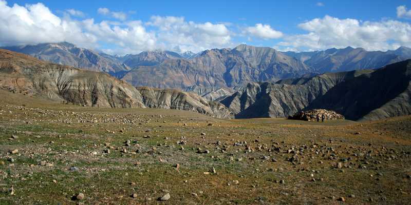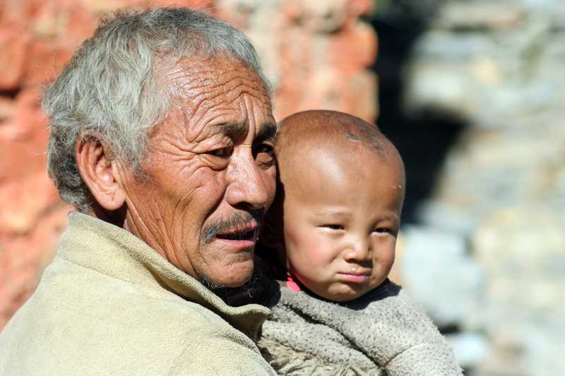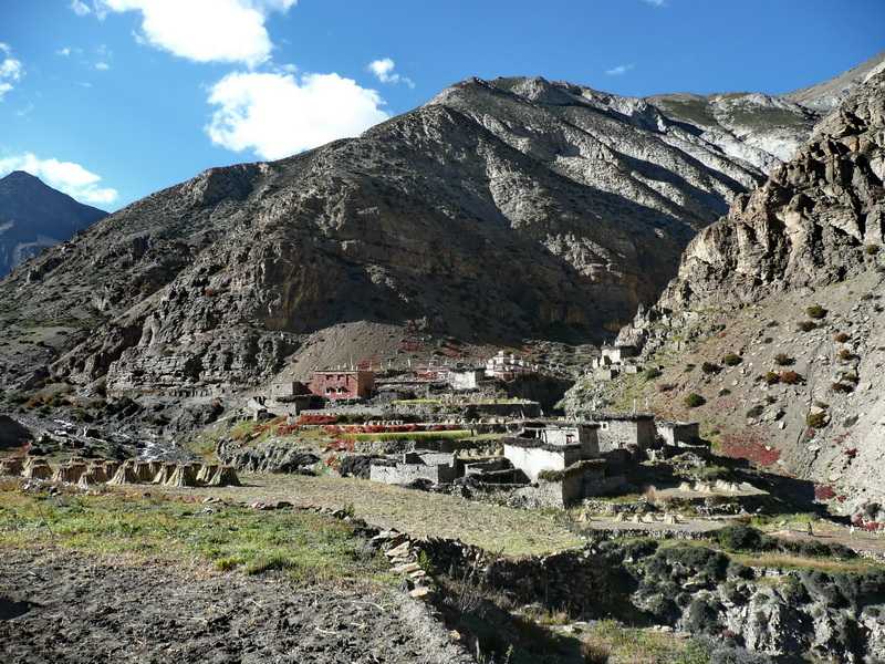 07. 10. 2010 In 4600 m Höhe erreichen wir nach 2½ Std. einen ersten kleinen Pass, verschnaufen etwas an der langen Mani-Mauer. Weiter gerade auf dem mit stachligen Grasbüscheln und Wacholderbüschen bewachsenen Bergrücken, gegenüber sehen wir das gezackte Felszinnenschloss, das uns noch weit überragt, sowie einige weiße Bergspitzen in der weiten tibetischen Landschaft. Auch unten im Namgung Khola geht ein Weg entlang, dieser ist aber länger als unsere Abkürzung über den Berg. In 4650 m Höhe erreichen wir bald darauf den zweiten mit Gebetsfahnen drapierten Pass, tief unter uns gurgelt der Fluss. 30 Minuten Mittagspause. Nun geht es auf gerölligen Serpentinen bergab nach Namgung oder Luri Gompa (4430 m). Von ferne erkennen wir, dass schon ein erstes rotes Zelt unseres Lagers aufgebaut ist. Rings um das Dorf gelbgrüne feldsteinbegrenzte Felder, auf denen Getreidepuppen aufgestellt sind. Die grauschwarzen Berghänge sind erodiert wie in einer Vulkangegend. Drei nepalesische Lehrer überholen uns, wollen von Saldang heute noch nach Shey weiter. Auf halber Strecke kommt uns der stets hilfsbereite Küchenhelfer Bragas entgegengeeilt mit einem Tablett voller Tassen und heißem Ananassaft. Der gute Service von Adventure Geo Treks lässt grüßen. Vom Camp aus können wir in Ruhe eine Herde von 15 Blauschafen, auch Bharals genannt, beobachten, die sich auf dem Hang über uns nicht stören lassen. Nach kurzem Verschnaufen besichtigen wir die Gompa von Namgung, der ältere Klostervorsteher mit Frau und Enkelkind zeigt uns das Innere, Masken, kleinere Metallbuddhas und viele Schriften. Dieses Kloster ist die Hauptwirkungsstätte des 1981 geborenen und als Wiedergeburt des vorherigen Tulku erkannten Dolpo Tulku Rinpoche Sherap Sangpo. Seine weiteren Klöster sind in Tokyu und Saldang. 2010 kam der Film „Dolpo Tulku – Heimkehr in den Himalaya“ von Martin Hoffmann heraus, er beschreibt den Weg des Hirtenjungen Sherap Sangpo zum hochstehenden geistlichen Oberhaupt im tibetisch geprägten Dolpo. Zum direkt in eine steile Felswand gebauten Bergkloster balancieren wir auf einem unscheinbaren Pfad durch ein steiles Grundstück. Leider ist es in erbärmlichem Zustand, teilweise verfallen und das Betreten sollte nur mit äußerster Vorsicht geschehen. Im dunklen Inneren eine große drehbare Gebetstrommel. Am Hauptkloster bekommen wir von der Frau des Lamas Buttertee mit echter Yakbutter ausgeschenkt, Phadindras Geld weist sie entschieden zurück. Am Fluss liegt ein Riesenstapel Bretter für das Kloster, einige davon tragen wir hoch zum Kloster. Wir bekommen unseren Five-O-Clock-Tee auf der Terrasse mit den Chörten, die neben unseren Zelten stehen. Die Sonne verschwindet 16 Uhr 20 schnell hinter den steilen Berghängen und es wird sofort kalt. 18 Uhr Abendessen und halb acht sind wir in unseren Zelten heute verschwunden.+ 805 / - 260 m in 4:50 Std. (1 Std. Pause) |