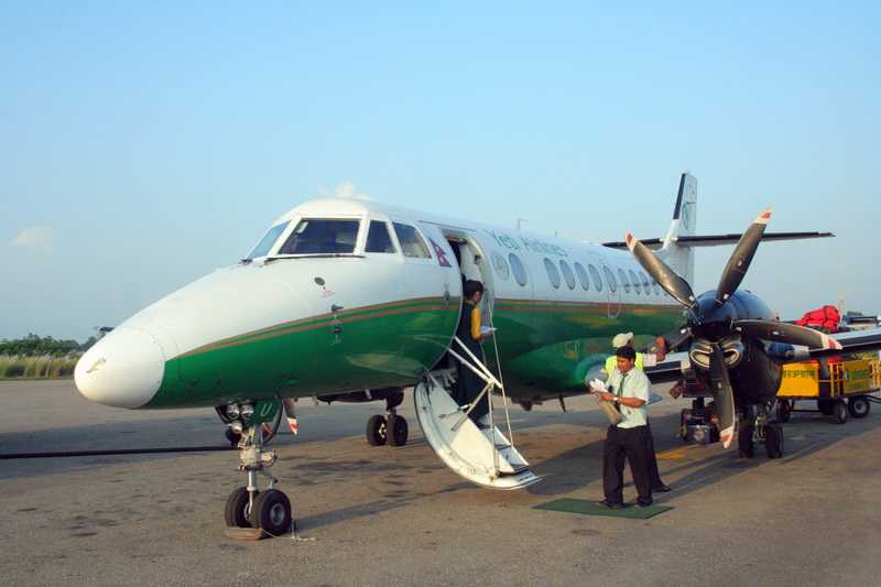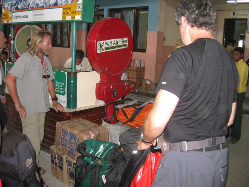 25. 09. 2010 Wir fahren zum Domestic Airport Kathmandu. Checken ein zum Flug nach Nepalgunj mit der Yeti Airline, jetzt Tara. Pünktlich um 16 Uhr 15 laufen die Propeller unseres 30-sitzigen Flugzeuges an, eine Stunde lang fliegen wir in den Westen des Landes. Unterwegs sehen wir rechts die Großen Weißen des Himalaya im Sonnenuntergang leuchten. Himalaya: alaya = Wohnstätte des hima = Schnee.