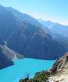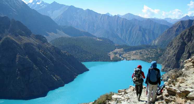 12. 10. Silver Forest Lake Camp. Früh sind es draußen immer noch minus 5 Grad, im Zelt ein Grad. Nach unserem Frühstück laufen wir zum Phoksundo See, der Wind ist kalt, aber die Sonne wärmt das Tal auf. Auf der rechten Seeseite führt der Weg allmählich am Hang hinauf. Wir kommen ins Schwitzen. Von oben bieten sich uns immer wieder Ausblicke auf das leuchtende türkisblaue Wasser. Deshalb machen wir ab und zu ein Päuschen, müssen auch unsere Mulis vorbei lassen.