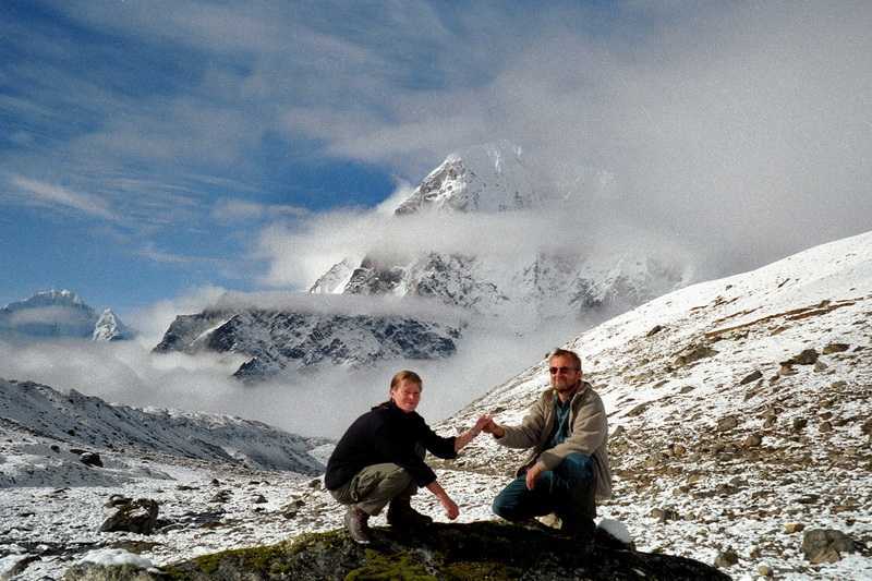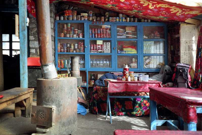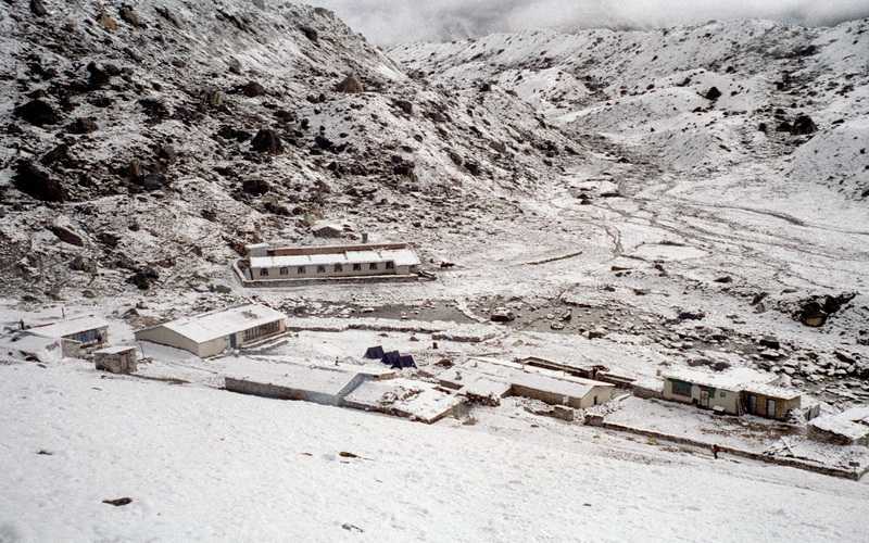 01.10.2001 Mittags erreichen wir Lobuche (4930 m), kommen in der Lobuche View Lodge in einem Dormatory, einem Massenlager in zwei Etagen unter, das einzige Zimmer ist belegt von einer Frau mit ihren kleinen Kindern, hier oben ungewöhnlich, die auf die Rückkehr ihres Mannes und Vaters warten, der wegen Höhenkrankheit absteigen musste. Zum Glück haben wir hier oben keine Probleme damit, auf alle Fälle war der vorherige Aufenthalt im Hochland von Tibet gut für unsere Höhenanpassung. In Lobuche gibt es inzwischen sogar zwei Hotels, im ersten kann man für 10 US-$ nächtigen. Im „8000 Inn“, gebaut von Italienern, für 20 $. Draußen ist es weiterhin sehr ungemütlich mit Schneeregen. Wir sitzen in der zugigen Lodge dicht am eisernen Ofen, der mit Yakmist gespeist wird und nur dürftige Wärme abgibt.
