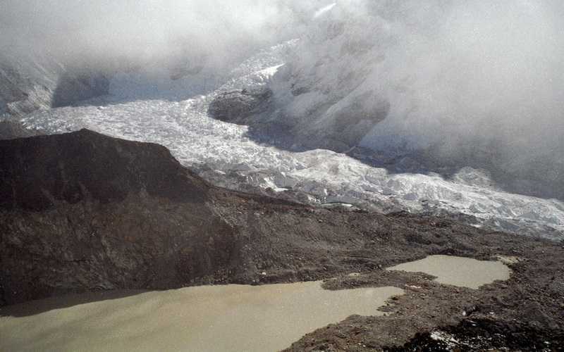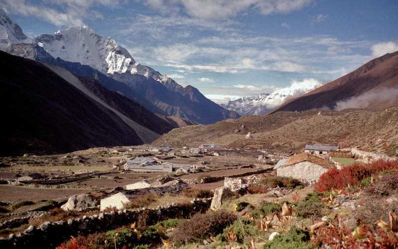 03.10.2001 Den Abstieg machen wir auf dem steileren linken Weg. Nach kurzer Pause verlassen wir die wenigen Lodges von Gorak Shep, wandern wieder nach unten, unser Ziel heißt Dingboche. Vorher Mittagessen in Lobuche, Besichtigung des „Memorials To Died On Everest“, der Gedenkstätte der verunglückten Bergsteiger und Träger. Leider ist die Sicht heute fast null, tagsüber leichter Schneefall. An Tughla vorbei über eine Brücke nehmen wir den oberen Weg links über das verlassene Dorf Dusa, kommen nach Dingboche (4350 m). Unser Himalayan Hotel ist ziemlich ausgebucht, im Aufenthaltsraum sitzen 28 Leute, wir haben schöne große Doppelzimmer. + 20 m / - 860 m in 4,5 Std. mit kurzen Pausen + 20 m / - 860 m in 4,5 Std. mit kurzen Pausen |
