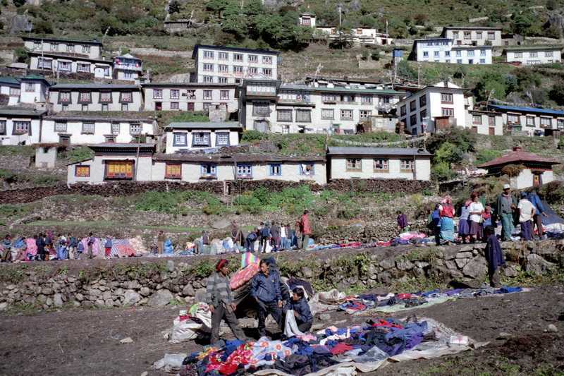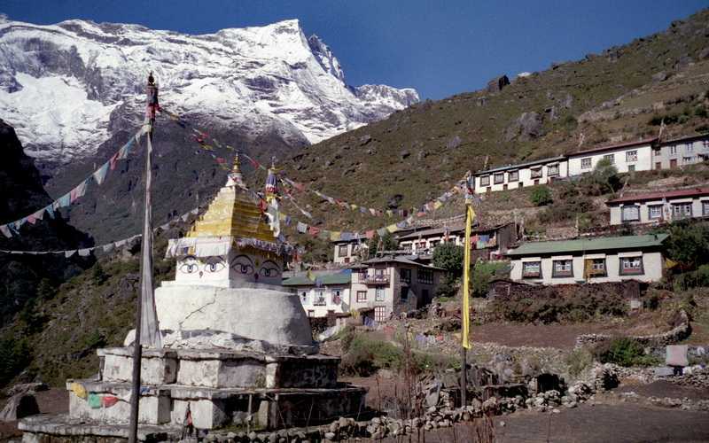 06.10.2001 In Phakting (2650 m) rücken wir wieder ein ins Khumbu Traveller Guest House. Abends lädt uns Carmen alle sieben ein zu Applepie – Apfelkuchen und Kaffee, eine kleine Geburtstagsrunde. Der Kuchen steht zwar in der Speisekarte, wird aber frisch gebacken und wir warten 1 ½ Stunden darauf, hier bei allen Essenbestellungen üblich. Danach ein gemeinsames Romméspiel. + 70 m / - 800 m in 4,5 Std. o. Pausen |