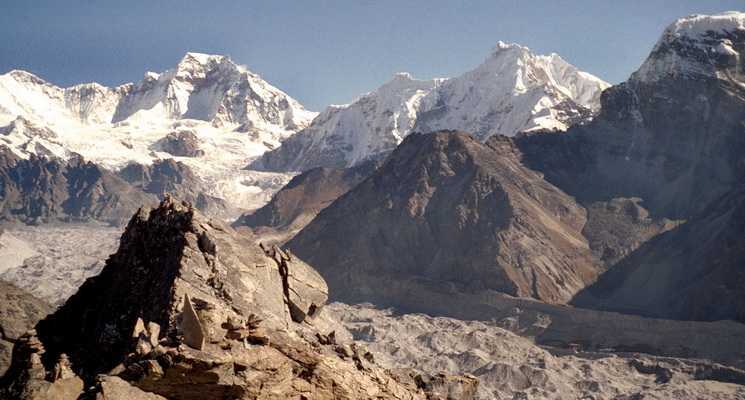 29. 09. 6 Uhr 30 starte ich mit Witz und Ram im dicken Nebel zur Besteigung des Gokyo Ri auf 5357 m, in 1 Std. 45 min. haben wir die 620 Höhenmeter geschafft. Nach 200 Hm ziehen die Nebelwolken wie von Geisterhand weg, wir erleben einen nepalblauen Himmel ohne das allerkleinste Wölkchen, haben am Aussichtsgipfel 2 Std. lang Rückenschauer ohne Ende. Zum Greifen vor uns liegen die höchsten Berge der Erde in ihrer ganzen Schönheit, der Pumori, der Cho Oyu, der Mount Everest, der Nuptse, der Makalu und ihre nicht minder schönen unzähligen kleineren Brüder.