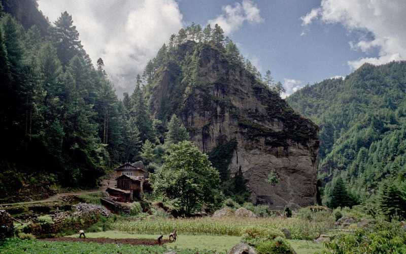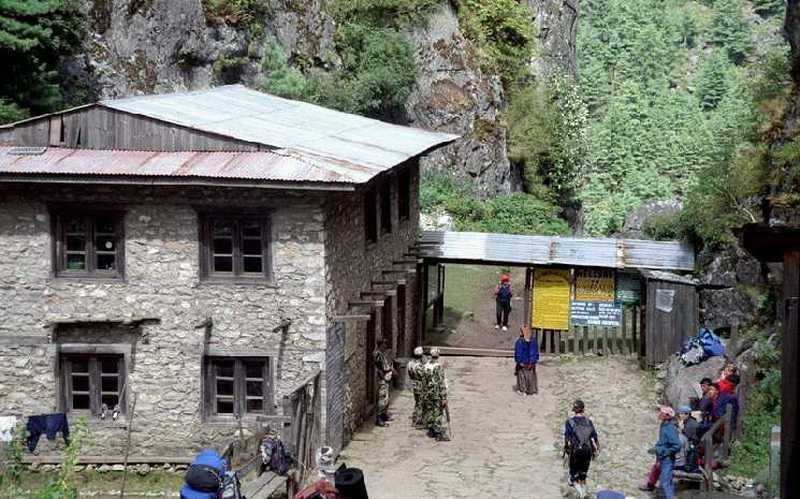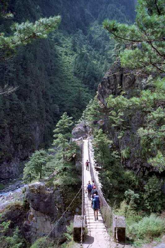 23.09.2001 ... es gibt das Nationalgericht der Nepalesen, Dal Bhat Takari, Reis und gekochte Linsen, gewürzt mit Salz, Pfeffer, Ingwer und Kardamom, sowie gebratenes Gemüse, zum Trinken nepalesichen Schwarztee. Wir haben einen schönen Ausblick auf die Berge und die schwankende Hängebrücke, die jetzt von einer Yak-Karawane überquert wird. Die Zubereitung des Essens dauert seine Zeit und die Pause ist meist 1,5 Std. lang. Wir sehen einige Sherpas, die barfuß schwere Stahlträger hochschleppen. Bei Larja Dobham müssen wir über eine 100 m über dem Fluss gespannte schwankende Hängebrücke, ein Yak gerät in Panik und Witz rennt um sein Leben, verfolgt von dem tollwütigen Yak, um auf der schmalen Brücke nicht aufgespießt oder hinuntergeworfen zu werden, hinterher haben wir aber alle herzlich darüber gelacht. Ab hier beginnt der steile Aufstieg nach Namche Bazaar (3440 m), einer großen hufeisenförmig an einen Berghang geschmiegten Stadt, in der ständig gebaut wird, mit vielen neuen Häusern, unzähligen Lodges, Verkaufsläden auch für Profikletterausrüstungen, sogar einen deutschen Bäcker gibt es hier. Aber keine Pinien mehr, nur noch sehr vereinzelt Bäume, sicher wurden die meisten abgeholzt für die Versorgung der Touristen. Unterkunft bekommen wir im Peregrin Inn, gebaut von einer australischen Gesellschaft. Es hat viele Einzel- und Doppel-Zimmer im ersten Stock, mit einfachen Betten mit Matratze, einer dünnen Stoffdecke und Kopfkissen, wo wir mit unseren Schlafsäcken darauf schlafen. Wir haben eine schöne Aussicht auf die Stadt, Mietzi duscht heiß für 150 Rupies – 5 DM. Es wird ein Eimer mit heißem Wasser an der Decke aufgehängt, man zieht an einem Strick und durch einen Schlauch mit Brause kommt das heiße Wasser ungemischt herab. Ich verschmähe solchen Firlefanz, wasche mich kalt in einer großen Aluschüssel, gleich noch meine Wäsche darin, unsere Begleiter sehen mir lachend dabei zu. Die Tibeter waschen sich für gewöhnlich gar nicht oder nur höchstselten. Nachts 13 ° C im Zimmer.