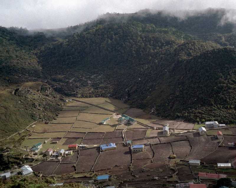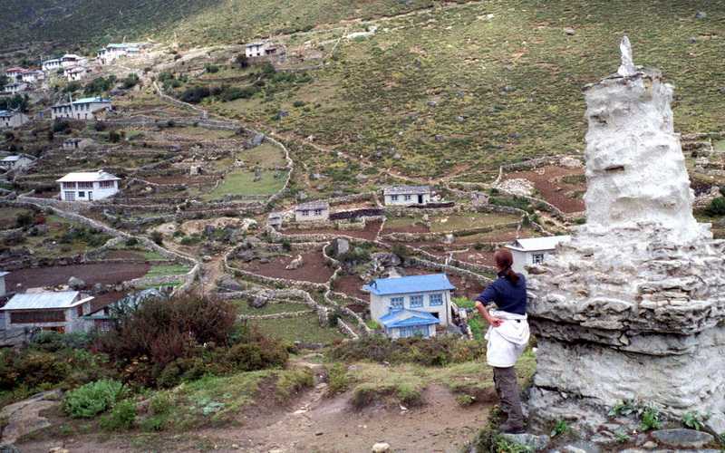 25.09.2001 Gleich daneben mehrere Getreidemühlen mit Wasserrädern. Haben herrliche Aussicht auf die kleineren Berge vor Khumjung. Auf dem Abstieg beobachten wir Kinder, die frische Yakfladen in ihre Körbe sammeln, diese werden geknetet, geformt zu flachen Deckeln und an die Wände der Häuser geklatscht zum Trocknen, später abgekratzt und eingesammelt zum Verfeuern in den kleinen eisernen Öfen der Lodges und Wohnhütten. Abends bringen wir unseren Portern Dumer und Gopal und unserem Führer Ram das Romméspiel bei, krönen das Ganze mit einigen Tassen Reisbier Chang, einem milchigen, nach Essig riechendem alkoholischen Gebräu, manchmal ungesiebt mit schlierigen Batzen, am Anfang gewöhnungsbedürftig, später recht lecker. Sitzen dabei schön um den heißen Eisenofen, gefüllt mit schwelendem Yakshit, herum. Musik kommt von Kassette, hier gibt es sogar Strom. Im Schlafzimmer ist es nachts 11 °C warm (oder kalt – wie man´s nimmt).