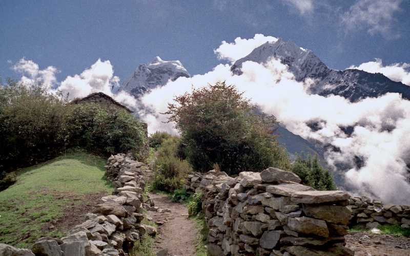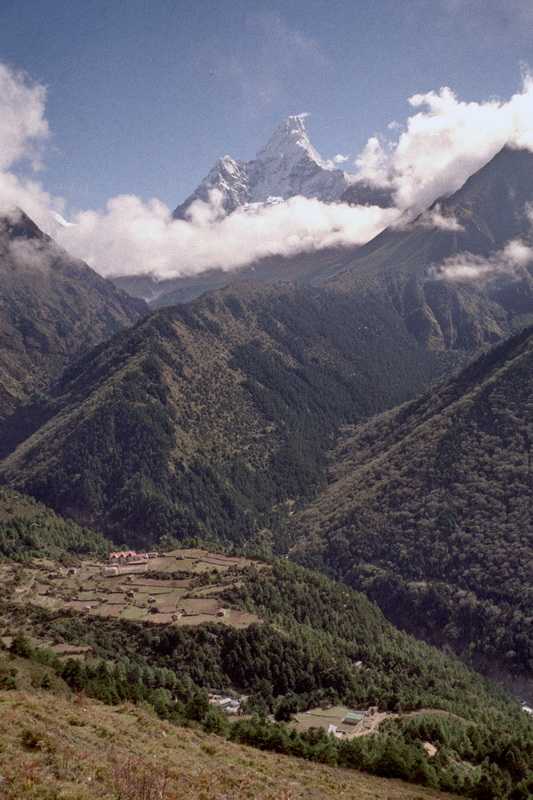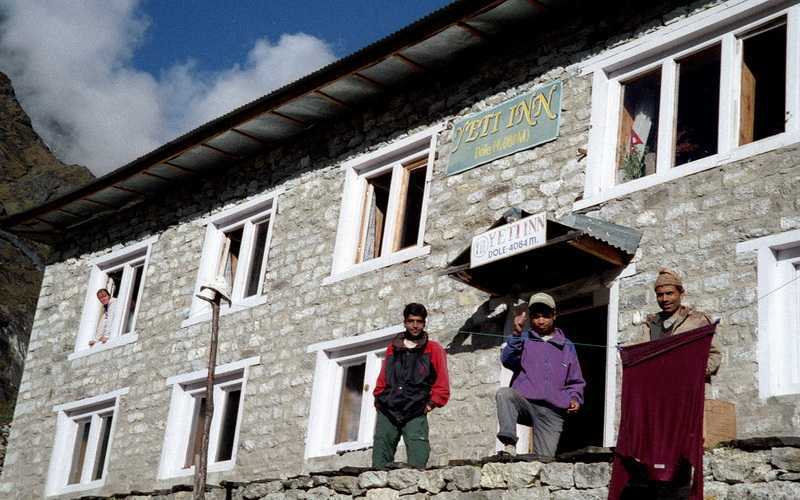 26.09.2001 Im Tal gegenüber liegt auf einem großen Plateau Phortse, weiter oben Tengpoche mit der großen Monastry auf dem Berg. Unten im Tal der Ort Phungi Drengka mit dem großen Summit Club Hotel mit rotem Dach. In 4000 m Höhe wachsen noch viele große Bäume, Pinien, Birken, eine Art Pappel, riesige Rhododendren, teilweise dicker grüner Nebelwald mit dunkelgrünem Moos an den Stämmen und hellgrünen hängenden Moosgeflechten. Mit dem Atmen haben wir wenig Probleme, da ja die Bäume und Büsche viel Sauerstoff abgeben. Unterwegs begegnen wir wieder einigen begleiteten Yakherden auf den Wanderwegen, beim Ausweichen muss man immer etwas vorsichtig sein, Yaks sind immerhin Wildtiere. Sie können nur in Höhen ab 2000 m bis 5000 m leben und werden zum Transport schwerer Lasten abgerichtet. Trinkwasserquellen gibt es überall reichlich, aus denen wir uns auch unsere Flaschen auffüllen, zur Sicherheit aber noch einige Tropfen Wasserentkeimer reintun. Der Dudkoshi entspringt dem Gokyo-Gletscher und begleitet uns schon seit Lukla. In Phortse Drengka (3680 m) bekommen wir zum Lunch sehr gute Hash Brown Potatoes, gebratene, grob geriebene Kartoffelpuffer. Ein Armeeposten ohne sichtbare Funktion dämmert vor sich hin. An einigen Wasserfällen vorbei geht es aufwärts nach Dolé auf 4100 m in die Lodge Yeti Inn. Hier treffen wir auch unsere Träger wieder, die kurz nach Khumjung eine steile Abkürzung, die Steep Stone Stairs genommen haben. Nach 17 Uhr dicker Nebel und Regen, in der Hütte am Ofen aber ist es sehr warm und gemütlich. Mietzi spielt mit Gopal Mau Mau. Im Zimmer sind 10 °C, draußen 6 °C. Nachts Regen, beim Gang über den Hof auf das Plumpsklo 3 Uhr ist der Himmel wieder wolkenlos.