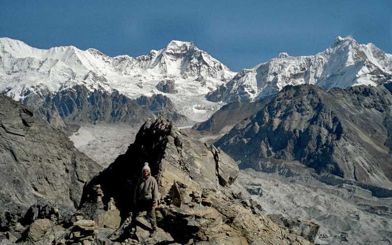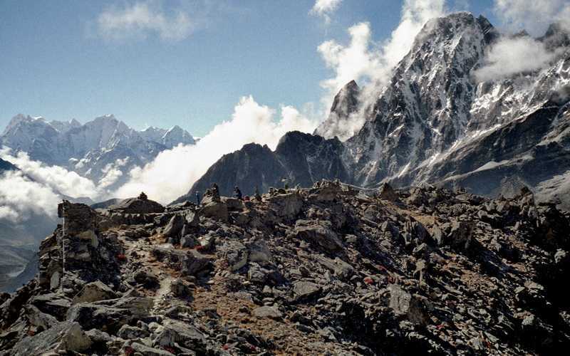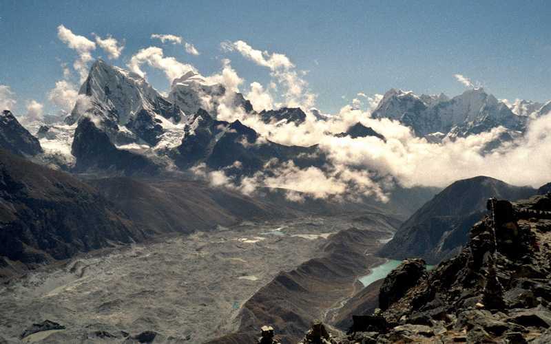 29.09.2001 Wir genießen lange die atemberaubende Landschaft in vollen Zügen, sind die einzigen hier oben. Langsam steigen wir wieder an den vielen Gebetsfahnen bergab, mit den ersten Wolken kommen gegen 10 Uhr auch die nächsten Touristen hoch, darunter auch im Alleingang Mietzi, die früh keine Lust zum Aufstehen hatte. 60 m vorm Gipfel treffen wir sie und im aufkommenden Nebel laufen wir gemeinsam den Rückweg nach Gokyo hinab. Carmen geht es heute auch etwas besser, sie hat sich die letzten Tage absolut tapfer gehalten und ist alles mitgelaufen, Hut ab. Nach dem Mittagessen, gebratenen Gemüse-Momos, marschieren wir wieder zurück zum ersten kleinen See und suchen dort den „Weg“ über den Gletscher, ca. ein km Luftlinie durch die Stein- und Eiswüste. Vorbei an grauen Eiswänden, schmatzenden Spalten, kleinen Gletscherseen und ständigen Abbrüchen, feinstem weißem „Ostsee“sand. Wir kommen an in der Chola La View Lodge in Dragnak oder Thangnak in 4700 m, die Rechtschreibung der Orte und Namen, ebenso die Höhenangaben darf man hier nicht so streng sehen. Wir bekommen die zwei einzigen Zimmer, da Ram unsere Träger immer schon vorschickt zur Reservierung, ansonsten ist hier ein großer Schlafsaal mit ca. 16 Doppelstockliegeflächen. Der kleine enge Aufenthaltsraum wird von einer Nepalesin betreut, die auch schon mit ihrem Nepal-Team in Deutschland und Österreich war, z. B. auf dem Großglockner. Morgen entscheidet sich nun, ob Witz und Carmen über den als schwierig eingestuften, nur bei gutem Wetter begehbaren hohen Chola La Pass mitkommen können, die Alternative für sie ist auf demselben Weg abwärts um den Berg herum, wo wir uns dann wieder treffen würden.