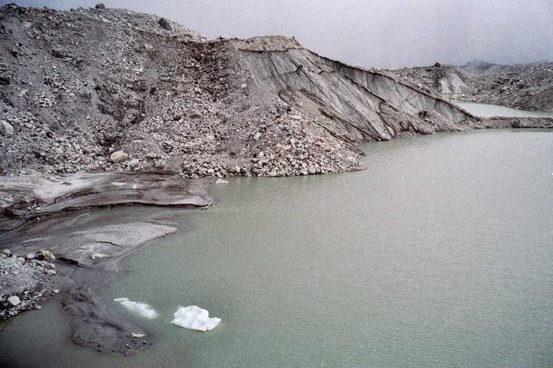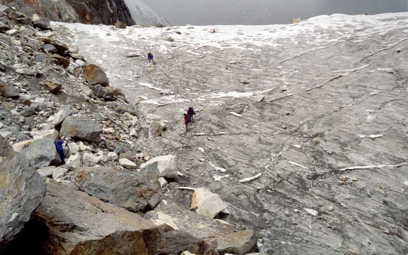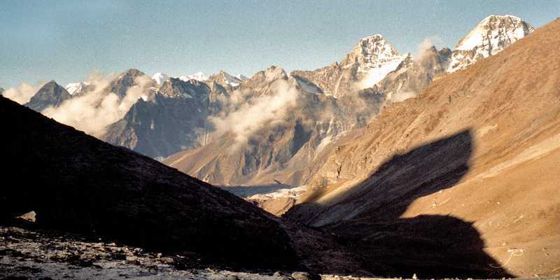 30.09.2001 Oben fallen wir uns alle um den Hals, freuen uns, es alle geschafft zu haben, alle jubeln, jeder bekommt ein Schlückchen Grünbitterer. Ich probiere den steilen Gletscher auf Schuhen runterzurutschen, Mietzi und Ram liefern sich eine Schneeballschlacht. Der 70 m hohe Abstieg vom Gletscher auf dem blanken Eis ist sehr rutschig, aber relativ ungefährlich, es geht weiter auf großblockigem Geröll abwärts zu einem Aussichtspunkt, dort verzehren wir unser mitgenommenes Lunchpaket, bestehend aus gekochten Eiern, Chapati (einer Art Eierkuchen), Keksen und Yakkäse. Weiter geht es hinab zum kleinen Örtchen Dzongla (4860 m), Unterkunft beziehen wir in der Green Valley Lodge, wieder in den beiden einzigen Zwei-Bett-Zimmern. Wir halten eine kleine Mittagsruhe, anschließend schreibe ich im geheizten Gemeinschaftsraum meine Aufzeichnungen, es war heute für mich der beste Tag bisher.