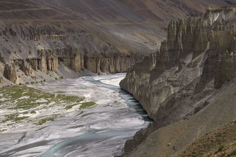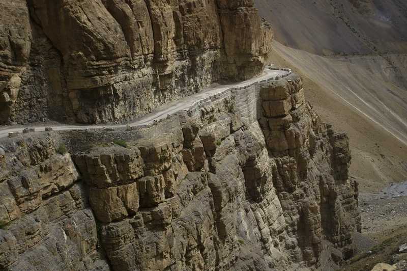 08.09.2009 ... ein Gletschersee zwischen Schneegipfeln auf 4270 m Höhe liegend, dessen Besuch wir uns für den Rückweg vornehmen. Am See gibt es ein Zeltcamp, das Dewachen EcoCamp. Dort beginnt auch der Trek zum Bara Shigri, einem der längsten Gletscher im Himalaya. Auf einem Schieferhang geht es jetzt in Serpentinen aufwärts. Gegenüber wird eine neue Straße in den südlichen Berghang gepickert, hier am Nordhang gibt es oft viel Schnee und Eis, was wir auf der Rückfahrt dann selbst „erleben“ dürfen. Auf 4000 m Höhe ist ein weiterer Fußweg zum See Chandratal (13 km). Auf 4551 m Höhe erreichen wir 10 Uhr den Kunzum La Pass, die Wasserscheide zwischen Spiti und Lahaul Valley. Es ist sonnig mit Wolken, nach einer kurzen Fotosession fahren wir weiter Richtung Spiti. Kurz danach das Schild „Welcome in Spiti Valley“ und „Losar 19 km“. Auch sehen wir wieder Bauarbeitertrupps, die die Straßen ausbessern.Unten im Spiti-Tal angekommen, erinnern mich die grün, gelb und braun pastellenen sanften Berge sehr an Tibet. Vereinzelt sind Nomadenzelte, sowie Yak-, Ziegen- und Schafherden zu sehen. Losar (4079 m) ist der erste Ort unten am Spiti River, ein kleines Nest mit Polizeiposten, wo wir unsere Reisepässe vorweisen und das erste Gruppenpermit abgeben müssen. Unsere Daten werden sorgfältig in einem Buch festgehalten. Die Häuser sind in typisch tibetischem Baustil errichtet, mit den bunten kleinen dicken Trapezfenstern, mit viel Holz auf den begehbaren Dächern und den länglichen Gebetsfahnen an den Stöcken. Ringsum sind Felder angelegt, um diese Jahreszeit meist schon abgeerntet, auf einigen ist noch Getreide zu sehen. Auch Wacholderbäume sind hier angepflanzt und eine Art Pappeln. Alle Häuser haben Stromanschluss. In Hanse stehen auch einige eher europäisch anmutende Häuser mit spitzen Dächern. Bei Kiato beginnt der Weg über den Takling La Pass zum Tso Moriri See, hier hat die Natur besonders schöne bizarre Felsformationen in den Steinsandhängen erschaffen. Kurz danach der Pfad links über den Lagudarsi La. Wir erreichen Key auf der rechten Flussseite, gegenüber am Berg das gewaltige Key-Kloster, das wir auf der Rückfahrt besichtigen werden. Im Hauptort Kaza (3640 m) 1½ Std. Mittagspause bis 15 Uhr, wir kosten Chowmein, gebratene Nudeln mit Gemüse, scharf gewürzt. Ab hier noch 47 km nach Tabo, unserem heutigen Ziel. Es hat angefangen, leicht zu regnen, was uns aber zu diesem Zeitpunkt noch nicht beunruhigt. 16 Uhr 30 erreichen wir nach reichlichen 150 km in 3250 m Höhe Tabo mit seinem berühmten Kloster. Unser Fahrer kennt ein schönes Gartenhotel, das Tashi Khangsar Hotel am Rand von Tabo gleich am Kloster und am Flusstal gelegen. Da es uns ebenso gefällt, ziehen wir ein in schöne Räume mit Doppelbett und Bad mit Dusche und WC. Mit Mietzi gehe ich im leichten Regen im Ort auf Erkundungstour, wir durchqueren schmale Betongassen zwischen großen tibetischen Häusern, es gibt im Ort mehrere Restaurants und umzäunte kleine Hotelresorts. Der Bevölkerung geht es wesentlich besser als den Bewohnern Tibets, es gibt hier in jedem Haus neben der obligatorischen Kuh Strom und oft sehen wir Satellitenschüsseln auf den Dächern und leuchtende Fernsehschirme in den Stuben. Vor einigen Häusern stehen Motorräder und Autos.