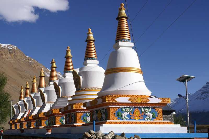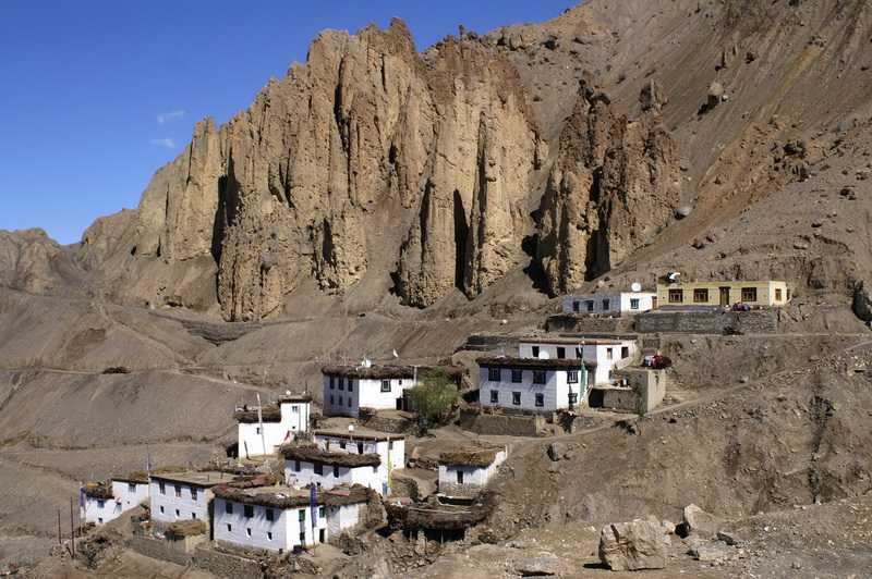 14.09.2009 ... dass eine Stunde oberhalb von Dhankar der malerische Dhankar Tso See liegt und eine wundervolle Aussicht auf die Zwillingsgipfel des Mane Rang (6593 m) bietet. Und das in alten Zeiten Dhankar die Haupstadt von Spiti war und ein König hier seine Residenz hatte. Im August diesen Jahres war der Dalai Lama zwei Tage hier anwesend, 2003 weihte er dieses Kloster. Inzwischen ist es für die Mönche Zeit zum Frühstück, ein Wassereimer mit Thukpa, einer Gemüsesuppe mit Teigeinlage wird herangeschleppt und verteilt. Auch ich gehe jetzt frühstücken in unseren Speiseraum, Eier, Chapatis, Marmelade und Butter. Anschließend besuchen wir die wie auf einem Adlernest errichteten Gebäude der alten Königsburg. Es lässt sich herrlich zwischen den alten Gebäuden herumschnüffeln. Sie sind jetzt bewohnt und werden teilweise als Ställe genutzt. Es gibt oben eine kleine Gompa von ca. 35 m² Innenraum. Unser Fahrer übernachtete bei einem Lehrer in dem großen roten Haus mit der auffälligen kleinen Spitze. Dieser erzählt uns, dass die Dynastie der Nono-Könige sich hier im 14. und 15. Jahrhundert in Kriegszeiten auf dem höchsten Punkt des Schlosses zurückzog. Damals gab es die Serpentinenfahrstraße noch nicht, der Weg führte direkt aus dem Tal hoch und durch ein großes Eingangstor. Kurz vor Mittag verlassen wir den idyllischen Ort und fahren wieder hinab ins Spiti-Tal. Als nächstes planten wir, das Pin Valley zu besichtigen, das Land der Ibex-Antilope und des Schneeleoparden. Ein populärer 8-Tage-Trek führt von hier über den 5319 m hohen Pin-Parvati-Pass ins Parvati Valley nahe Kullu. Wir sehen leider auf der anderen Flussseite, dass die in dieses Tal führende Straße an einigen Abschnitten von Erdrutschen verschüttet ist. Es sind zwar Straßenarbeiterinnen mit dem Beräumen beschäftigt, diese nehmen sich wie Ameisen in der gewaltigen Landschaft aus. An der Kreuzung fragt uns ein Franzose, ob wir ihn bis Kaza mitnehmen würden, wir laden ihn ein. Er ist die ganze Strecke, über 30 km aus dem zugeschneiten Pin Valley mit seinem schweren Rucksack herausgelaufen, wollte dort Berge besteigen und hat es abbrechen müssen. Das Lalung Tal stand ebenso auf unserem Plan, auch hier sehen wir, dass am Abzweig bereits die ersten Meter der 8 km langen Straße total verschüttet sind, hier geht ebenfalls gar nichts. Nach 1½ Std. Fahrt erreichen wir unbehelligt den Hauptort im Spiti-Tal Kaza, unser Fahrer empfielt uns das in New Kaza neben dem Kloster gelegene Sakya Abode, darüber ein großes Schild „Long Life H. H. 14th Dalai Lama“, ein buddhistisches Hotel. Na, hier sind wir doch wohl richtig. Das nagelneue prächtige farbenfrohe Sakya Kloster in Kaza wurde ebenfalls im Juli vom Dalai Lama geweiht. Ich treibe einen der 150 Mönche auf, der uns das neuerrichtete Klostergebäude an der Seite aufschließt, auch innen ist alles vom Feinsten und neu eingerichtet. Fotografieren darf man meist, aber ohne Blitz. Heute die erste Möglichkeit für mich, ein paar Postkarten einzukaufen, sogar eine Post gibt es hier, nur der Eingang ist schwer zu finden. Briefmarken für 8 Rp. muss man auf eine Karte nach Europa kleben. Abendessen im noblen Restaurant unseres Hotels, in dem auch viele Gäste von außerhalb sitzen, nur das Godfather-Bier ist nicht nur nicht nobel, sondern absolut eklig, wir quälen uns die Flasche zu viert rein, einer schiebt es dem nächsten zu, igitt.