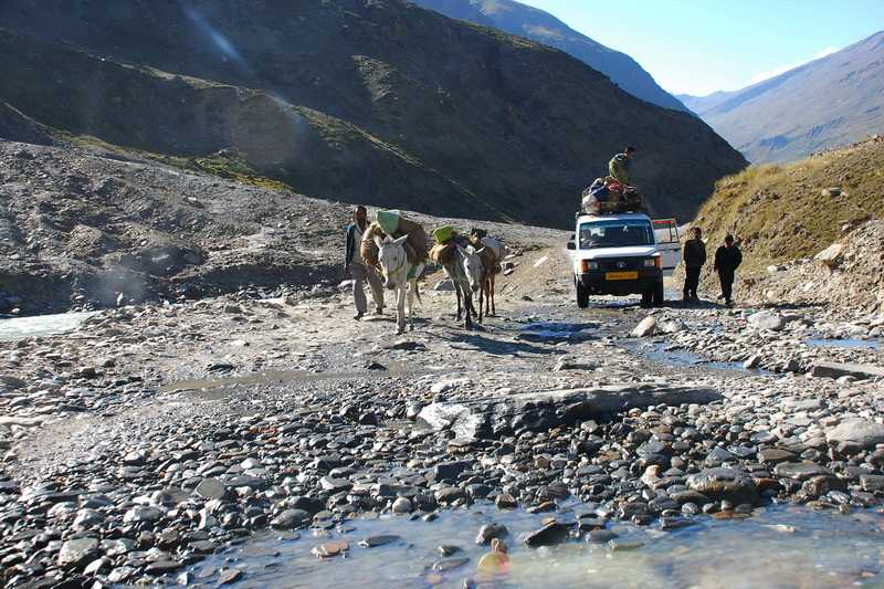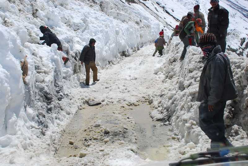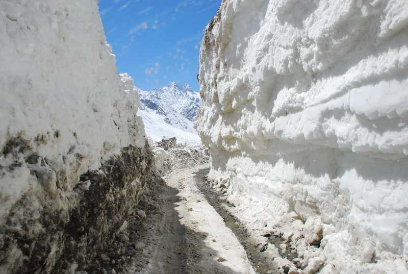 18.09.2009 ...... Es sind hier regelrechte Schnee- und Eislawinen abgegangen über die Fahrstraße, die von den Arbeitern mühsam durchstoßen wurden, teilweise bis 8 m Höhe, wir schlängeln uns durch dieses Gletscher-Chaos hindurch, manchmal stößt das Dach oben an oder wir schrammen seitlich am Eis. Auch in der Gegenrichtung wollen Autos an uns vorbei, es ist absolut eng und von den Fahrern wird alles abverlangt. Mich wundert es, dass es immer wieder klappt, mit Rangieren, Vor- und Zurückfahren aneinander vorbei zu kommen. Jeden Augenblick kann eine neue Schnee- oder Steinlawine die Straße und uns überrollen, da die heiße Sonne den Schnee zum Schmelzen bringt. Große Wasserrinnsale fließen über und entlang der Straße. Endlich, endlich wird der Schnee weniger, wir gelangen allmählich etwas tiefer hinunter. Als wir 13 Uhr 30 auf 3360 m in Chhatru ankommen, atme ich auf, der Schnee ist zurückgeblieben, wir legen eine Verschnaufpause mit einem Tee an einer der Sommerrestaurants ein. Ich muss gestehen, dass ich in diesen zwei Stunden Angst gehabt habe. Wenn das meine Mitreisenden auch eher auf die spaßige Art sehen, mir war das Ganze nicht geheuer. Die Einheimischen sagen uns, dass es zu dieser Jahreszeit noch nie so ein starken Winter- und Schlechtwettereinbruch gegeben hätte. Wir fahren zurück über die Brücke nach Gramphoo zum Abzweig nach Manali, von wo aus unsere Reise begann. Jetzt fahren wir aber gerade aus weiter Richtung Leh. In Khoksar (3140 m) legen wir am Polizeiposten eine weitere Pause ein, unsere Pässe werden wieder einmal von uns verlangt. Danach weiter auf der rechten Seite des riesigen Chandra-Flusses, es beginnt eine breite asphaltierte Straße, unser Fahrer dreht auf. Vorbei an kleinen Dörfern, vielen hohen grünen Bäumen und Feldern erreichen den schönen Ort Sissu (3100 m), ab hier eine Baustelle für die neue doppelspurige Nationalstraße mit vielen Baumaschinen und hunderten Arbeitern. Da hier viele Armeefahrzeuge entlang kommen, ist hohe Priorität angesagt. In Tandi (2920 m) ist die letzte Tankstelle auf der Hauptstraße nach Leh, wir tanken voll, für 34 Rp. den Liter Diesel. Hier führt eine Sackgasse ins Pattan Valley nach Udaipur. Übrigens liegt Dharamsala, der Zufluchtsort des Dalai Lama und vieler Exil-Tibeter auch nicht weit von hier westlich von Manali. 17 Uhr erreichen wir Keylong (3348 m), die Hauptstadt von Lahaul, den freundlichen Ort mit ca. 12.000 Einwohnern, an beiden Flusshängen des Bhaga-Tales malerisch ausgebreitet. Hier halten die Busse zwischen Manali und Leh über Nacht. Wir quartieren uns im Hotel Snowland ein, alles vom Feinsten. Große Zimmer, TV, Dusche, WC, Handtücher, Balkon. Der zweite Hotelmanager ist ein Nepalese aus Helambu, Yashi Lama, er begleitet uns für einen kurzen Bummel durch das Zentrum von Keylong. Zum Abendessen im Restaurant im Nebengebäude gibt es Hühnchen-Curry mit Kartoffeln und Reis, Banana-Lassie, abschließend Kingfisher-Beer.