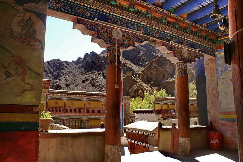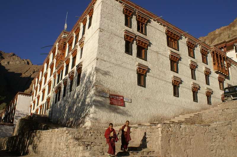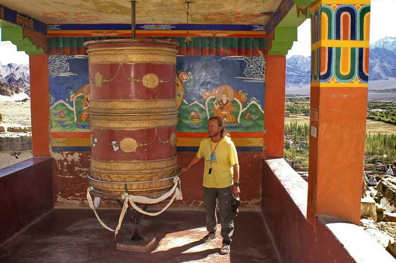 25.09.2009 ...sie ist 5 Meter hoch und enthält Millionen bedruckter Gebetsstreifen. Neben der mehretagigen Haupthalle gibt es im ersten Stock eine große Statue von Padmasambhava bzw. Guru Rinpoche zu sehen. In einer Schlucht liegt, eine Gehstunde oberhalb von Hemis, die Einsiedelei Götsang, in der schon lange vor Gründung des Klosters ein Mönch lebte. 11 Uhr verabschieden wir uns von Hemis und verlassen auf der anderen, jetzt wieder rechten Straße vorbei an den gewaltigen Manimauern die heilige Stätte. In der Garnison Kharu geht es jetzt links ab nach Leh, unserem heutigen und letzten Ziel in Ladakh. Ein 4 km langer Wasserkanal zieht sich links der Straße entlang. Nach 8 km in Stakna links ein kleiner Klosterberg. 12 Uhr erreichen wir die Thikse Gompa, unser Fahrer fährt uns hoch bis vor den Eingang des imposanten Felsenklosters, das an den Potala-Palast in Lhasa erinnert. Wir werden uns 14 Uhr unten wieder mit ihm treffen. Da wir gerade zur Mittagspause ankommen, essen wir erst einmal etwas im Klosterbistro. Danach besichtigen wir vom Klosterhof aus die umliegenden Tempel. Den Versammlungsraum oder Tschokhang, den Figurenraum oder Tsankhang und den Raum der furchterregenden Schutzgottheiten, den rußgeschwärzten Gongkhang. Im Maitreya-Tempel sitzt auf einer Lotusblüte der Chankhang Maitreya Buddha der Zukunft. Wir laufen zwischen den alten Gebäuden nach unten zur langen Manimauer, wo uns Rigzin zu sich nach Hause einlädt. Er wohnt zusammen mit seinen Eltern und Brüdern in einem schmucken Haus direkt unterhalb des Klosters. Wir sitzen im Gästezimmer auf Teppichen, schlürfen Tee und knabbern Kekse. Nach einem gemeinsamen Foto vor seinem Haus fahren wir das kurze Stück weiter nach Shey. Wir parken an einem umzäunten heiligen Teich mit vielen Fischen und Enten unterhalb der Ruinen des alten Königspalastes. Shey war 500 Jahre lang die Hauptstadt von Ladakh, bis im 15. Jahrhundert der Königssitz nach Leh verlegt wurde. Der Palast besitzt die größte Freiheits-Stupa in Ladakh, die Namgyal-Chörten, deren Spitze aus purem Gold besteht. Wir besichtigen im Shakya-Thubpa-Tempel die 8 m hohe wertvolle Statue des Buddha Shakyamuni aus dem Jahr 1633. Die Mutigen von uns klettern hoch zwischen den alten Ruinen auf die Bergspitze, hier hat man eine spektakuläre Sicht auf den sumpfigen Teich und das gesamte weite grüne Tal, das hier von hunderten weißer Stupas übersät ist. 16 Uhr fahren wir weiter nach Leh. Links sehen wir den Klosterberg von Spituk, der leider von drei Seiten von Armee eingegrenzt wird. Auf der breiten Straße herrscht jetzt dichter Verkehr, an den Straßen kleine Läden und Autoreparaturwerkstätten. Aber auch große Chörten und riesige überdachte Gebetsmühlen. Die nach Westen führende Straße wendet sich jetzt nördlich den Berg hinauf. Auf ihr Kleinwagen, Taxis, Jeeps, Motorräder, Kleinbusse, Minibusse, Schulbusse, große Busse, Lastwagen, Armee-Fahrzeuge. Seit wenigen Jahren ist Leh regelrecht vom Verkehr überflutet worden. Es ist auch viel Polizei präsent. An den Straßenrändern nummerierte Bushaltestellen. Vor uns öffnet sich eine große weite Ebene mit vielen Häusern, teuren Hotels, dem Königspalast, einer japanischen Gompa auf einem Hügel, wir fahren über einen Kreisverkehr auf einer vierspurigen durch eine Mittelmauer abgeteilten Straße weiter hinauf und rechts durch ein großes buntes Tor. Das ist das Ziel unserer langen Reise, das ist die Hauptstadt von Ladakh, das ist Leh. Leh wurde im 14. Jahrhundert gegründet, es hieß anfangs Sle oder Gle, das wurde aber später von den deutschen Herrnhuter Missionaren in Leh umgewandelt. Ladakh hat 120.000 Einwohner, Leh hat 26.000 Einwohner und liegt auf einer Höhe von 3500 m. Wir erreichen die Innenstadt, eine große Gebetsmühle dreht sich zu unserer Begrüßung. Hier gibt es Laden an Laden, bunte Werbeschilder zuhauf, etliche Touristen und noch viel mehr Einheimische, ein Gewimmel wie im Ameisenhaufen. Das soll also unser Ziel gewesen sein. Auf der Straße ist rush hour, das heißt, es geht nicht rasch, eher sehr langsam vorwärts durch die vielen Autos. Wir sehen auch islamische Moscheen. An einer Kreuzung treffen wir die Mitarbeiterin einer mit Antrek befreundeten Agentur, sie geleitet uns zu einem etwas außerhalb im Ortsteil Chubi gelegenen in feinstem tibetisch-ladakhischen Stil neuerbauten Privathaus mit Zimmervermietung, dem Namdruk Guest House. Wir verabschieden uns herzlich von unserem zweiten Fahrer Rigzin, der zurück nach Thikse zu seinen Eltern fährt, auch er bekommt ein kleines Trinkgeld von uns. Im ersten Stock des Guest Houses bekommen wir schöne Zimmer mit einem gefliesten Bad, warmer Dusche und WC. Die Betten sind frisch bezogen, ebenso werden wir die frisch überzogenen weichen Zudecken benutzen. Es ist hier nachts auch nicht mehr so kalt wie weiter oben in den Bergen. Erstmal den Boiler einschalten und ausgiebig duschen. Abends laufen wir 15 Minuten hinunter ins Zentrum von Leh, gehen in die bekannte tibetische Speisegaststätte „Summer Harvest“, hier muss man vorreservieren. Das Speiseangebot an Hühnchen und Hammel ist vortrefflich, nicht zu teuer, das Kingfisher-Bier und die Banana-Lassies kalt genug. Unser Haus ist mit glatten Marmorböden ausgestattet, sodass wir vor der Außentür unsere Schuhe ausziehen. Die Decken der Zimmer sind in ladakhischem Stil gebaut, dicke lange Stämme tragen viele kurze übereinandergelegte dünne Stämmchen, alles ist mit einer dicken Schicht Erde bedeckt. Manche der Zimmer und der Flur im ersten Stock haben einen Balkon. Man kann auch das Dach betreten, hat hier eine gute Aussicht auf Leh, auf die Rückseite des Königspalastes und die japanische Stupa. Im Erdgeschoss wohnt die Familie des Besitzers mit ihren Kindern. Strom gibt es fast immer bis auf kurze Abschaltungen. |