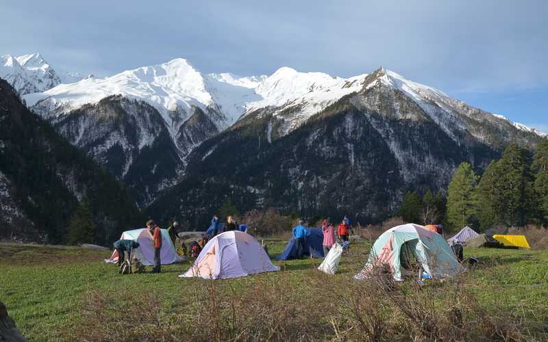 Unsere Zelte sind bereits nach wenigen Minuten erreicht. Normal sollte das heutige Camp direkt in Har ki Doon errichtet werden. Sicher haben die Träger sich geweigert, die 3 Stunden extra unser Gepäck dorthin und wieder zurück zu schleppen. So übernachten wir auf der grünen Zeltwiese 1½ Gehstunden vor Har ki Doon in 3250 m Höhe.