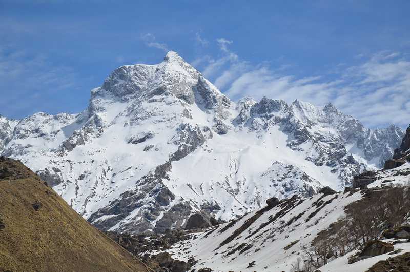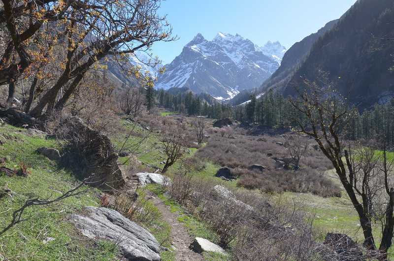 Am Ufer des Bergbaches eingebettet in eine einmalige Landschaft liegt Har ki Doon. Mehrere Lodges stehen hier oben im Schnee, jetzt noch verschlossen. Über ein Schneefeld gelange ich mit Steffen Kr. und Hansi zur letzten Hütte mit atemberaubendem Blick auf die bezaubernden Gipfel der Swargarohini Peaks (6252 m). Man kann guten Gewissens das hintere Har ki Doon Tal als ein gut gehütetes verstecktes Hidden Valley, vielleicht sogar als Shangri-La bezeichnen.