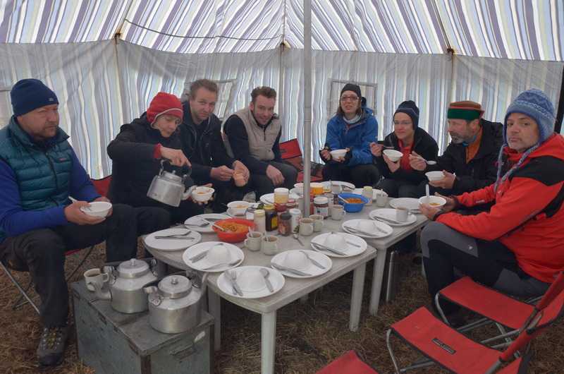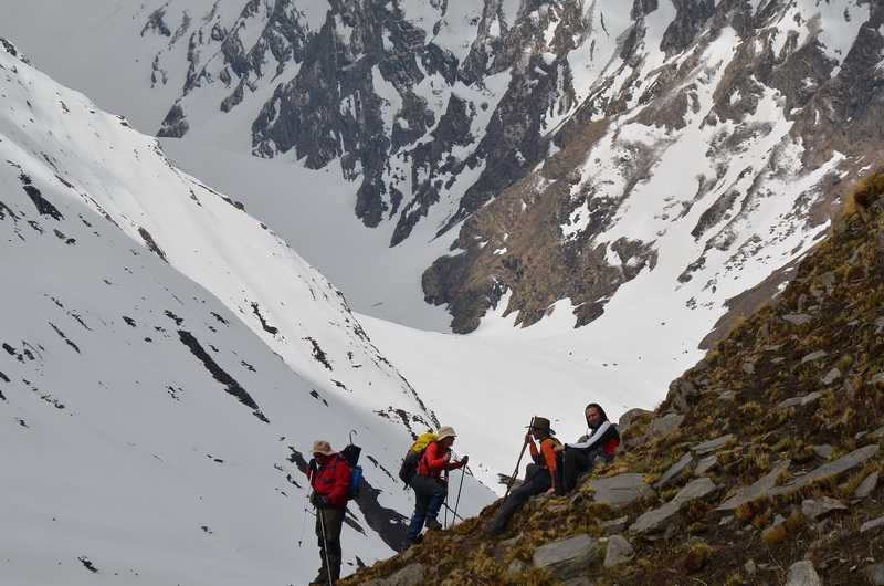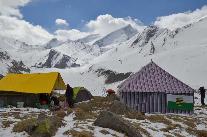 30. 04. 2013 ...Oberhalb der Schneefelder gelangen wir auf einen 10-20 cm schmalen Erdpfad, eine Ziegenspur, und traversieren auf dieser durch einen steilen grasbewachsenen schwarzgelb verbrannten Erdhang hoch über dem Tal bis zu einem Felsenband. Unterwegs passieren wir kleinere Seitentäler mit sehr steilen Schneehängen, wo wir beim Queren aufpassen müssen, um nicht abzurutschen. Ein Träger rutscht ab und gleitet 10 Meter abwärts, kann sich aber durch den unter seinem Körper zusammengeschobenen Schnee fangen und wieder hochklettern. Zwischen den senkrechten Felsenwänden heißt es, vor allem beim Abstieg aufzupassen, es sind leichte Kletterstellen dabei. Hier sollte man unbedingt schwindelfrei sein. Ab und zu kann man sich an größeren Felsen etwas ausruhen. Ein Träger zeigt mir rechts das blendendweiße tiefverschneite Seitental, das zum Bali Pass hochführt. Nach zwei Stunden tut sich vor mir ein riesiges Tal auf, mit zwei Moränen, zwischen denen einst ein Gletscher floss. Am linken Berghang der linken Moräne sehen wir winzige Pünktchen durch die Schneefelder laufen, unser Weg ins Lager. Der Himmel um uns herum über den hohen Schneebergen ist hellblau und nur leicht bewölkt, nur in unserem Abschnitt gehen einige Graupelschauer auf uns nieder, lassen uns aber zum Glück nicht nass werden. Wir aber laufen immer noch den jetzt flacher werdenden Hang entlang. Nach drei Stunden lassen wir den Steilhang hinter uns zurück, und über mehrere schnee- und schuttbedeckte Seitenmoränen gelangen wir am linken Talrand entlang auf Schneefeldern aufwärts und zuletzt zum Rand der großen Moräne, wo es jählings in den Abgrund zum Gletscher hinabgeht. |