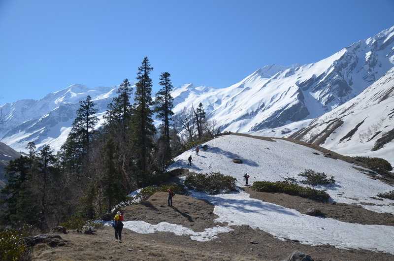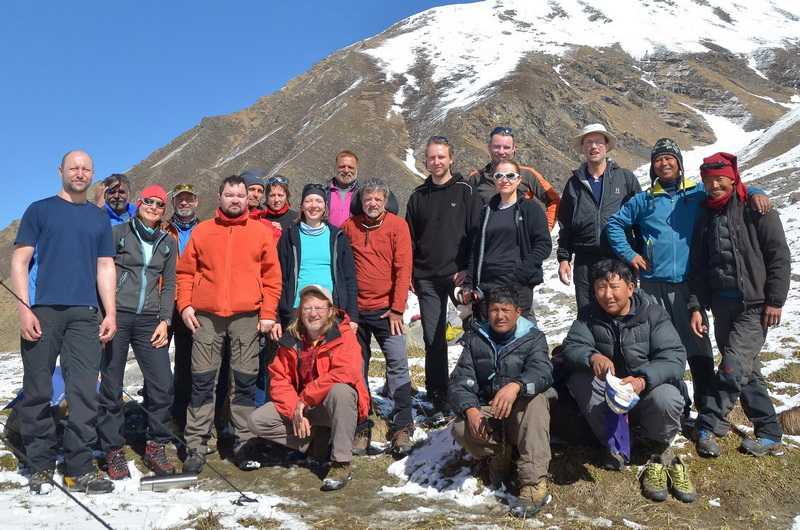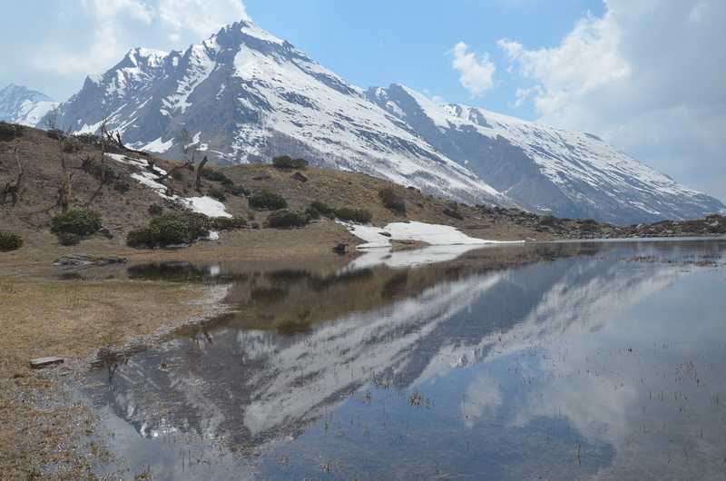 02. 05. 2013 ...Bergab nicht so anstrengend wie der Aufstieg, auch die Felsenkletterstellen erweisen sich in dieser Richtung einfacher. Nach 3 Stunden erreichen wir das Ufer des Sees wieder in 3610 m Höhe, wir haben nur noch zwei Gästezelte, das Küchenzelt, das kleinere Speisezelt und Shashanks Zelt. Unsere 16 Träger schlafen wieder in der unterhalb des Sees liegenden Steinhütte.