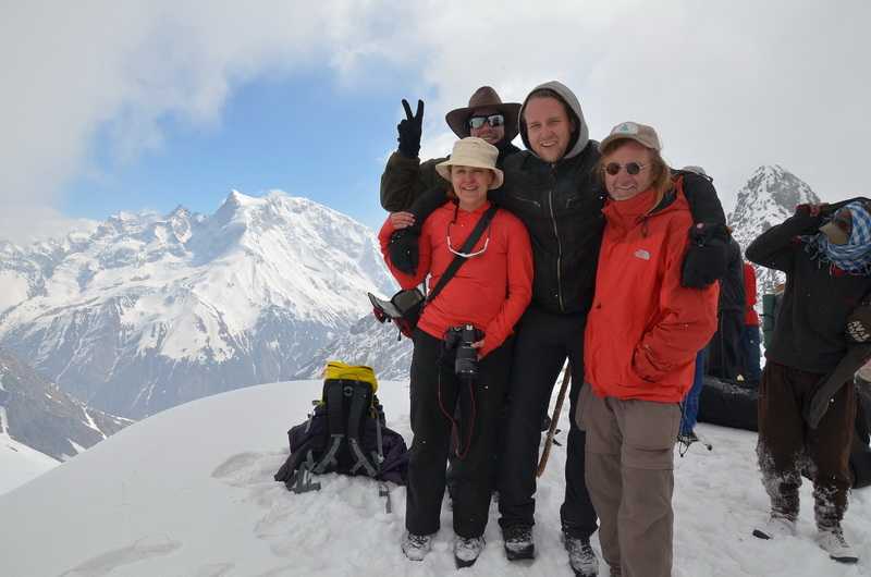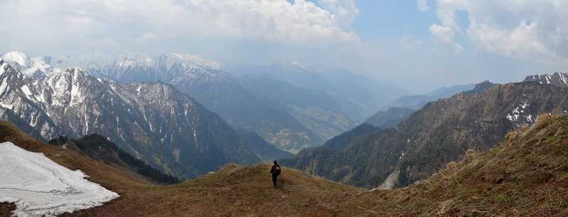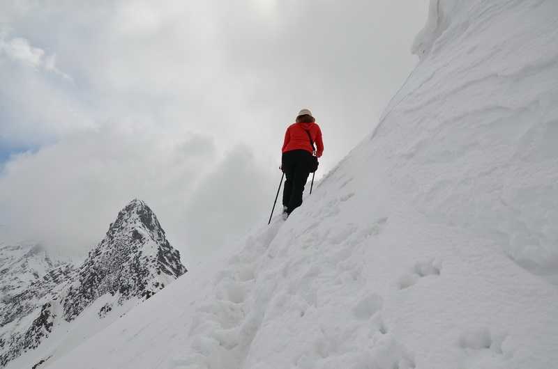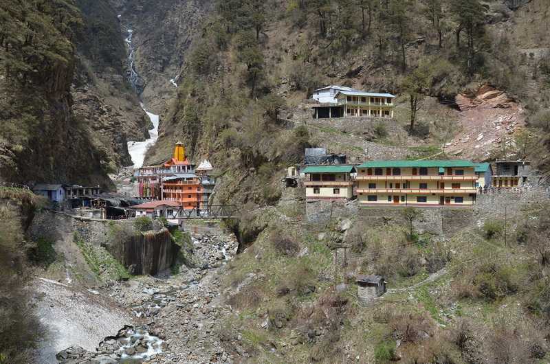 04. 05. 2013 ...Den Pass erreichen wir im Aufstieg über extrem steile Schneefelder und weiter oben auf Schneebrettern, jeder muss richtig aufpassen, wohin er tritt, um nicht in die Tiefe zu stürzen. Die erfahrensten Träger haben den Weg gespurt, in den Tritten kann man sicher aufsteigen. Runtergucken sollte man besser nicht. Zum Glück sind es nur 270 Höhenmeter, gut, dass wir gestern bis so weit oben gekommen sind. Alle Personen unseres Treks schaffen es sicher bis nach ganz oben. Wir stehen auf dem Sattel des Bali- oder Yamunotripass in 4880 m Höhe und auf beiden Seiten geht es nur steil hinab. Die erfahrenen Träger kennen den Weg genau, es ist nur an einer Stelle möglich, ins Tal abzusteigen. Am Anfang sehr steil, dann moderater über endlose Schneehänge gelangen wir langsam in tiefere Gefilde. Ab und zu ist hier der Schnee schon von den braunen Wiesen geschmolzen, kleine zusammengedrückte Büsche schmiegen sich an den Boden. Es kommen einige felsige Kletterpassagen steil nach unten, unser treuer Itbir gibt jedem von uns an den zwei rutschigen Schlüsselstellen Hilfestellung. Es ist kein richtiger Weg zu erkennen, nur an den mäßig steilen Hängen sieht man Trittspuren vergangener Zeiten. Mich wundert es, wie die Träger hier und auch 2 Tage später von der Seemawiese über den Dharwa Top zum Dodital von den weitläufigen steilen und unübersichtlichen Schneefeldern immer wieder mit schlafwandlerischer Sicherheit die Einstiege in der richtigen Höhe in die Pfade der aufgeweichten Erdhänge finden. Ganz weit unten sehen wir bereits das Tal des Yamuna Rivers, der in Yamunotri entspringt. Dort wollen wir heute noch hinunter. Die Pfade abwärts verbreitern sich allmählich, wir kommen in die Region der Bäume und laufen hinab und hinab. Itbir weist uns den Weg, er ist so weit voraus, dass wir ihn immer gerade noch sehen. Von Shashank, den beiden Köchen und den Trägern sehen wir schon lange keine Spur mehr. Bald jedoch stoßen wir an einem mitten auf dem Weg liegenden, kleinen Campsite im moosbehangenen Urwald auf unsere komplette Mannschaft, die hier Ihre Esspause einlegt. Laut Plan sollen wir heute in Yamunotri übernachten, mit Rücksicht auf die Träger werden wir aber weiter unten in Janki Chatti bleiben, die meisten Träger, unsere Köche und Shashank gehen von hier direkt dorthin. Wir aber machen mit Itbir als Guide und einem weiteren Träger den “Umweg“ über den heiligen Ort Yamunotri. Unterwegs blühen die Rhododendrenbäume. Wir kommen endlich an einen betonierten breiten Weg, der rechts nach Janki Chatti, das von oben wie eine Schrebergartenanlage aussieht, links aber nach Yamunotri führt. Wir treffen einige indische Studenten. Weiter unten sind bereits einige besser betuchte Pilger zu sehen. Als zwei Wochen später unsere Expedition nach Yamunotri kommt, wimmelt es hier nur so von indischen Pilgern, die zu Fuß hochlaufen, auf Tieren hochreiten oder sich hochtragen lassen. Auf einem bequemen gut ausgebauten Weg laufen wir stets auf der rechten Seite der schmalen steilen Schlucht allmählich abwärts, vorbei an weiteren kleinen Tempeln und mit Wellblech gedeckten Unterstellplätzen. Wir durchqueren ein Seitental über eine Brücke. Gegenüber donnert ein ca. 250 m hoher Wasserfall. Die “normalen“ Wasserfälle zähle ich gar nicht erst. Die Felsflanken ragen mehrere hundert Meter über uns auf. Eine Maultierkolonne kommt uns entgegen, sie versorgen Yamunotri mit allem Lebensnotwendigen. + 445 m / - 2.430 m in 9:00 Std. (2:30 Std. Pause) |