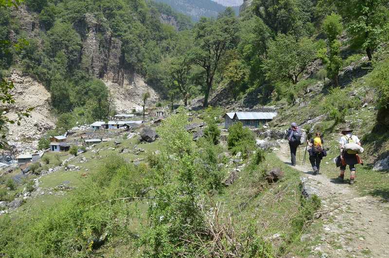 08. 05. 2013 ...Wir gehen am letzten Trektag bei wolkenlosem Wetter auf der rechten Seite des Baches, der dem See entspringt, abwärts in einem dichten Wald voller hoher dick bemooster Baumriesen entlang, bis wir zu einem riesigen Seitental kommen. Es sind mit uns noch 3 besser betuchte stolze Inder unterwegs, Großvater, Vater und Enkel. Der schöne Panoramaweg ist breit und gut ausgebaut, man merkt, dass hier öfter Touristen und Pilger hochfinden. So wundert es uns nicht, unterwegs zwei weißen Touristinnen mit großen Rucksäcken und wenigen schwer schleppenden Trägern zu begegnen, die auf dem Weg nach Yamunotri sind und sogar über den Bali Pass nach Har ki Doon wollen. Shashank erzählt mir später, dass sie es nicht schafften. Wir kommen an einigen Rastplätzen vorbei, aus Steinen errichtet. Dann durchqueren wir ein kleines Dorf aus Holzhäusern, Chattri. Weiter unten liegen die Dörfer Bhewra oder Bebra und Agoda. Itbir zeigt uns Abkürzungen, die den breiten Panoramaweg kreuzen und im Zickzack steil nach unten führen. Wieder auf dem Hauptweg gelangen wir zu einem markanten Felsvorsprung, dahinter geht es sehr steil hinunter zum Dorf Bebra (2220 m). Es gibt hier mehrere Lodges, Restaurants und einen schnuckligen Mini-Campingplatz. Wir leisten uns eine kalte Coca-Cola für 50 INR und ruhen uns vom Abstieg aus. Nach 30 Minuten Pause überqueren wir den Fluss in der Talsohle, es geht leicht bergauf durch frischgrüne Wälder nach Agoda (2250 m). Auf unserem schönen Panoramaweg läuft man wie auf einem Aussichtsbalkon durch ein riesengroßes gewaltiges Bergtal mit vielen von Flüssen tief eingegrabenen Seitentälern. Am Grund schäumt weiß und wild der Bingsi Gad und später nach dem Zufluss mehrerer Flüsse bei Gajoli der Asi Ganga. Er hat im vorigen Jahr, wie schon erwähnt, ein ganzes Dorf zerstört und viele Menschen getötet. Die Sonne brennt aus wolkenlosem azurblauen Himmel unbarmherzig auf uns herab. Je tiefer wir kommen, umso heißer wird es. Neben einzelnen schlanken hohen Tannen und kleinen ebenmäßig geformten hellgrünen “Weihnachtstannen“ wachsen hier wieder bis 30 m hohe moosbehangene Rhododendrenbäume mit teilweise über einem Meter Stammdurchmesser. An manchen Bäumen leuchten bereits die Blüten, während an anderen noch die Knospen zu sehen sind. Die Leittiere einer über hundertköpfigen Ziegenschar bleiben erst scheu stehen und äugen um die Ecke, als sie uns bemerken, dann drängen alle an uns vorbei. Wir sehen schon in der Ferne unser Ziel im Tal vor uns liegen, den Straßenendpunkt, wo ein Jeep auf uns wartet. Das letzte Stück suchen wir uns den Weg nach unten im Alleingang, auch Itbir ist den anderen nachgeeilt. Aber der Weg ist gut zu finden, auch ein größerer Hangrutsch wird gemeistert. Die letzten Serpentinen gehen noch einmal in die Knochen, aber schließlich haben wir nach 24 km und ca. 1600 Höhenmetern Abstieg das Flusstal des mörderischen Asi Ganga erreicht. Der Ort heißt Sangam Chatti (1675 m) und besteht nach der Flut nur noch aus wenigen Hütten und einer Flussbrücke. Auf dem Platz erwarten uns unsere Jungs schon ungeduldig, das Gepäck ist bereits auf den bereitstehenden Jeep und unseren 12-Sitzer-Minibus, der aus Delhi herbeordert wurde, aufgeladen worden. Die 15 Träger steigen alle dichtgedrängt in ihren Jeep, der sie nun wieder zurück in ihre Heimat bringt. Ich muss ausdrücklich jedem von ihnen noch einmal zum Abschied herzlich die Hand drücken. Wobei mir wieder die Tränen in die Augen steigen. Meine Mitreisenden überrasche ich zum Dinner mit gekühltem indischen Godfather-Bier, dass Shashank mit mir in einem vergitterten Alkoholladen nebst Obst und Gemüse erworben hat. Das Bier hat 5 % Alkohol und die Flasche 640 ml, Preis 110 INR. Dafür sind wir mit unserem Kleinbus wieder ein Stück die Hauptstraße zurück und dann links über den Bhagirathi 2 km ins quirlige Uttarkashi gefahren. Die Brücke nach Uttarkashi wurde zerstört und ist jetzt durch eine stählerne Militärbrücke ersetzt worden. Die zweite Brücke steht noch zur Hälfte. Hier gibt es riesige blühende Bäume, die blaulilafarbenen sind Chakaranda und die gelben Silver Ferns, Silberfarn, wie unser Hotel in Delhi. Nach dem Essen machen wir noch einen Verdauungsspaziergang die Straße hoch und zurück. Sozusagen sehen und gesehen werden. Die Inder bekommen Stielaugen von Julias Hotpants. Stephan nutzt gleich die Gelegenheit, sich bei einem Barbier gründlich und professionell rasieren zu lassen. Es ist eine langwierige Zeremonie mit eincremen, einseifen, erste Rasur, erneut einseifen, zweite Rasur. Nach dem Abtrocknen werden verschiedene Cremes und Wässerchen in die kinderpopoglatte Gesichtshaut einmassiert und zuletzt Parfüm aufgesprüht. Zufrieden und hochglänzend verlässt Stephan das Geschäft. Vor unserem Hotel sitzen der gut betuchte Inder aus unserem Hotel inmitten seiner rotgewandeten moppligen Frauen und Töchter. Wir werden oft von den Einheimischen gefragt, aus welchem Land wir kommen, so auch hier. Deutschland ist immer für alle ein gesegnetes gutes Land, das sie loben. Eine seiner Töchter arbeitet in München. |