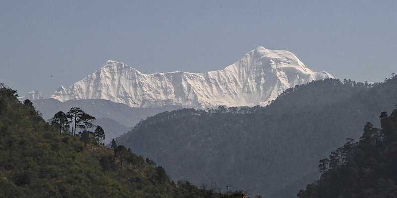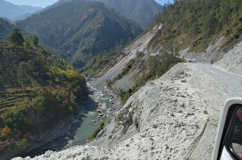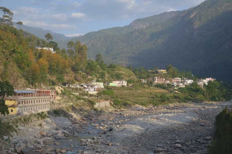 Unsere Mittagspause machen wir auf einem Hügel mit Blick auf den zu einem grünen See gewordenen Bhagirathi Fluss. Wir sitzen unter Blue Pines, Himalaya- oder Tränenkiefern (Pinus allichiana), unsere Köche machen uns ein vorgekochtes Reis-Menu warm. Bei Tehri verlassen wir den Fluss und fahren über einen 1676 m hohen Pass bei Chamba. Von hier führt eine Straße nach Mussoorie, die zweite nach Devprayag zum Zusammenfluss von Bhagirathi und Alaknanda zum Ganges.