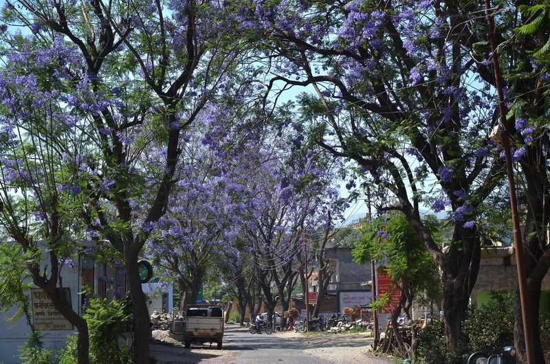 09. 05. 2013 ...Früher konnte man unten am Ufer des Flusses entlangfahren. Die Flusslandschaft sieht aus wie ein riesiger Tagebau mit einem grauen Fluss in der Mitte. Es gibt viele Seitentäler und Seitentäler der Seitentäler, die wir alle weitläufig umfahren. Auf der einspurigen Straße sind häufig Heilige Männer, die Sadhus unterwegs. In den Orten sehen wir oft einen der heiligen Pipal-Bäume stehen, unter dem einst in Lumbini der Ur-Buddha Shakyamuni seine Erleuchtung hatte. Diese Bäume kann man nicht einfach aussäen oder anpflanzen, ihr Samen wird von Vögeln aufgepickt und später auf natürlichem Weg wieder ausgeschieden. Der tierische Verdauungsprozess ist für den Prozess der Keimung und Reifung der Samenkörner notwendig. Der Monsun sorgt dann dafür, dass die Samenkörner aufgehen.