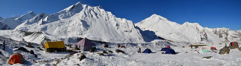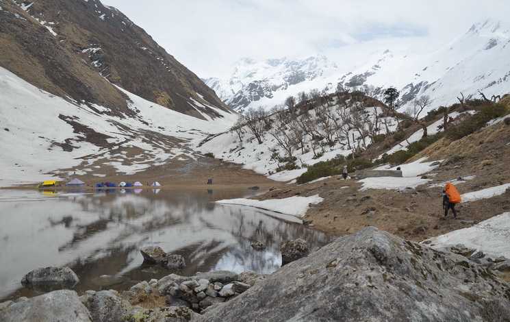 29. 04. Dev Thatch. Wecken bereits 10 vor 6 Uhr. Über uns entlädt sich eine dunkle Wolke und überschüttet uns mit Graupelkörnern. Das gleicht das gute Frühstück mit Porridge und einem wunderbar fluffigen Omelett wieder aus. Trekstart ist halb 8 Uhr und unser Ziel heißt Ruinsara Tal. Das ist aber kein Tal, sondern ein See. Langsam verziehen sich auch die dunklen Regenwolken. Im engen Ruinsara Tal liegen viele teilweise vereiste Schneefelder, die von weit oben als gewaltige Schneelawinen, hier Avalanches genannt, ins Tal geschossen sind.