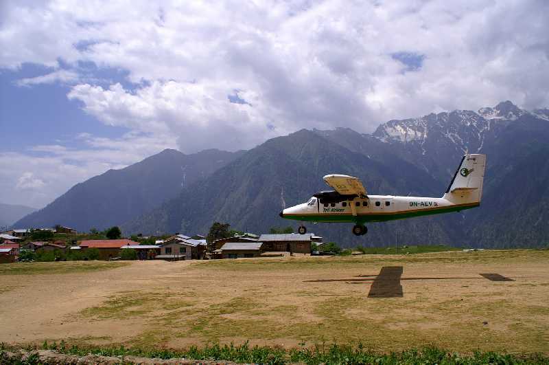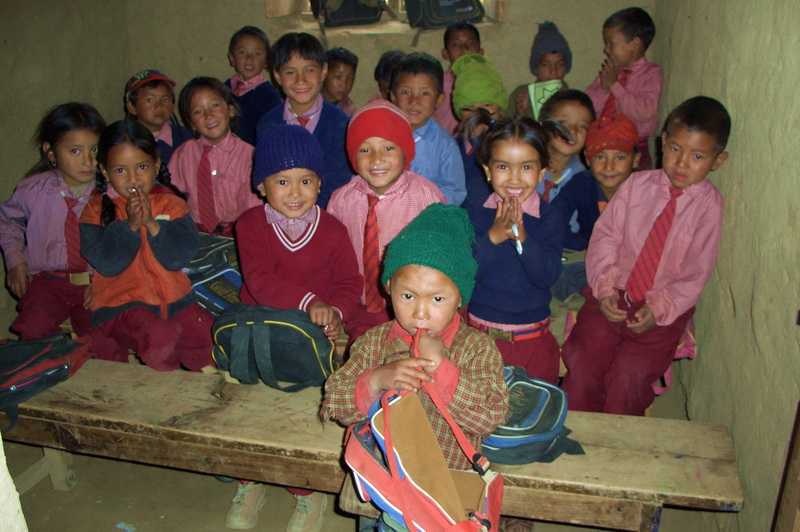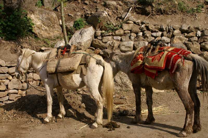 31. 05. 2006 ...wir haben Glück, die Landebahn erscheint links vor uns in einem Seitental und wir setzen auf einer huppeligen steinigen Erdpiste auf. Phadindra begleitet uns auf dem Flug. Eine Wanderung hierher würde ca. zwei Wochen dauern, eine Straßenverbindung gibt es nicht. Da sich einige feiste Inder in den ersten Sitzreihen gleich mehrere der von der Stewardess angebotenen Flugbonbons nehmen, bleibt für uns hinten das Nachsehen. Ein Teil der 137 indischen Kailash-Pilger, die ebenfalls zum Sagadawa-Fest am Kailash wollen, war früh vor uns schon eingecheckt, wir können warten und den zweiten Flug nehmen. Die uns später parallel begleitenden Österreicher haben weniger Glück, sie müssen einen Tag in Nepalgunj warten, da am Flugtag die Sicht gleich Null ist. Wir fragen uns, wie die meist reichen behäbigen, dicken Inder die Kailash-Kora schaffen werden, später kriegen wir mit, dass sie von Simikot auf die Höhe von Tibet mit Hubschraubern gebracht werden, von Akklimatisation kann keine Rede sein. Nicht ohne Grund sterben jährlich einige Menschen bei der Umrundung des Mount Kailash. Wir werden abgeholt von unserem neuen Führer Sang Bahadur Rai, Sanga genannt, er erinnert mich in seiner Art, seinem Reden und seinem Lachen etwas an Niru, der uns am Kangchendzönga führte. Ihn begleiten unser Koch vom Manaslu-Trek Dorje Rai, sowie unser Freund Pasang, der hier die Österreichergruppe erwartet. Wir begrüßen uns herzlich. In einem Lodgehotel bekommen wir Getränke und unser Mittagessen. Auch die vielen Inder in ihren weißen Gewändern und leuchtend orangen Tüchern sind wieder hier und machen lautstark mit Gebeten und Gesang, alles von einem Kameramann gefilmt, auf sich aufmerksam. Lautstark regt sich auch Iris auf, als Sanga 5 $ zusätzlich anfallende nicht voraussehbare Trekkingkosten von uns kassieren will, im Stillen schäme ich mich vor ihm für sie. Unsere Pässe und ein Passfoto werden noch benötigt, um das Trekkingpermit der Humla-Region zu aktualisieren. Ein älterer Österreicher lebt schon seit einem halben Jahr hier und leitet ein nepalesisches Hilfsprojekt aus Wien für das hiesige Krankenhaus, versucht, mit den Spendengeldern das Niveau der Krankenhelfer, des Hygieneverständnisses und der Einrichtung ein bischen zu heben. Die Humla-Region, in der wir uns befinden, ist die ärmste von ganz Nepal und die fünftärmste Region weltweit. Man sieht es auch an der Bevölkerung, die meist sehr elend und abgerissen aussehen. Früher kannte man hier nur den Anbau von Reis und Gerste, ernährte sich sehr einseitig. Die Menschen sehen aus wie Nordinder, sehr dunkel und hager. Sanga erzählt uns von seiner ersten Tour vor 12 Jahren, als Simikot noch aus 20 ärmlichen Lehmhütten bestand, kein Vergleich zu den jetzt teilweise stattlichen, zinnblechgedeckten Häusern, den Schulen, der Kanalisa-tion heute. 2000 Einwohner ca. leben jetzt hier, eine Familie hat oft 8 – 12 Kinder. Abwanderung nach Kathmandu gibt es kaum, da die Überlebens- und Einkommenschancen dort noch schlechter als hier sind. Man lebt außer dem spärlichen Kailash-Tourismus von der Landwirtschaft, Viehzucht und Tauschhandel, führt Salz aus Tibet ein. Wir machen einen Rundgang durch Simikot, landen in einer Grundschule bei vielen Kindern zwischen vier und 10 Jahren, alle in Schuluniform, wo wir im Zimmer des Prinzipal (Direktor) auch etwas Geld für sie spenden. Auch einen Maoistenstützpunkt gibt es hier, erkennbar an den roten Fahnen, doch dazu später. Dorje heuert drei Küchenhelfer in Simikot an, Siteh Sunar (=Blacksmith), den großen immer Freundlichen, den 16jährigen hilfsbereiten Dhan Bahadur Shahi und den eher trägen jungen Birgit Shahi mit der Dopi (nepalesische Kappe) und dem dunklen ernsten Gesicht. Wir packen unsere Säcke für den Trek, sie werden zusammen mit einigem schweren Küchenzubehör auf vier Pferde und zwei Mini-Esel verladen, der kleine Pferdemann ist der freundliche Tambatsiring Lama, der andere heißt Pambdorje Lama, der Eselmann ist Nana Sunar, alle aus Simikot. Nach dem Essen starten wir unseren Humla-Trek zur tibetischen Grenze entlang des Humla Karnali Flusses, vorbei an Weizen- und Gerstenfeldern, einfachsten mit Lehm und Stroh gedeckten Hütten auf einem mit Cannabis und Nesseln gesäumten felsigen Pfad, laufen an den Steinhäusern des oberen Simikot und der Gemeinschaftswasser-versorgung vorbei. Es sieht nicht weit aus, aber es ist ein 300 m langer Anstieg zum Gipfel eines aufgeforsteten Bergrückens, der die Stadt überblickt. Der Trek macht dann einen langen, steilen Abstieg auf einem felsigen Serpentinenpfad, führt oberhalb der Dächer des Dorfes Dandaphoya entlang. Weiter an einem alleinstehenden Haus vorbei, dann nach Tuling, auch bekannt als Majgon, ein kleines Thakuri-Dorf auf 2290 m Höhe. Es gibt einen kleinen Zeltplatz mit neuem Küchen- und Toilettenhaus auf einer Terasse eine halbe Stunde nach dem Dorf über die blaue Stahlbrücke direkt am rauschenden Nebenfluss Shara oder Hepka Khola, Darapari Khola wird er von den einheimischen Kindern genannt. Der nachfolgende nahe Ort heißt Chauganphaya. Unsere drei gelben Expeditionszelte, die dem Sherpa Dome ähneln, werden von Sanga und Phadindra errichtet, das blaue Esszelt ebenso. Witz und Iris genießen wieder das Privileg eines Einzelzeltes. Wir bekommen wie immer einen Eimer mit warmem Wasser, Seife und Handtuch bereitgestellt. Auf dem Dach einer Lodge bauen zwei Stuttgarter ihr oranges Vaudé-Mark II-Zelt auf, sie werden ebenfalls zum Kailash wandern. Im Hintergrund stehen steile Berge, auch hohe Schneeberge, Fünftausender, sind zu sehen. Die felsige Landschaft ist dicht bewachsen mit Bäumen und Büschen, Wasserfälle stürzen herab. Beim Nachmittagstee bekommen wir Besuch von Tausenden Fliegen, die sich an unseren Keksen und dem Milchpulver laben, ein Zeichen der mangelnden Hygiene der hiesigen Bevölkerung, wir erleben es das erste Mal so in Nepal. Auch die Dorfkinder bekommen ihre Bonbons und Kaugummis,