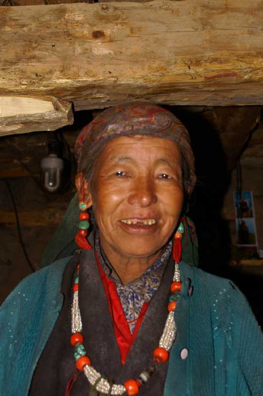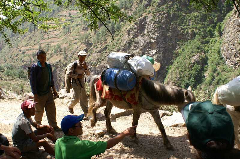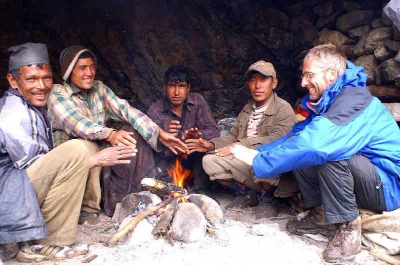03. 06. 2006 ...Wir bekommen in unsere 300 ml fassenden Blechtassen heißes Zitronenwasser, eine Wohltat. Die Pause ist heute kürzer, da es doch recht kühl ist, Witz läuft männlich herb mit kurzen Hosen, in der Kälte sind seine Gänsehauthuckel deutlich zu erkennen. Die alte Strecke folgt einem steilen Pfad und zieht sich über einen 3500 m hohen Bergrücken, den Illing La Pass, glücklicherweise können wir jetzt einem neuen, niedrigeren Pfad folgen, der den Anstieg und steilen rutschigen Abstieg vermeidet. Der Pfad sucht sich seinen Weg beängstigend nahe am Fluss in einem auf einigen Abschnitten mit Steinen und hölzernen Stützen aufgebauten Weg, wo der Pfad aus dem Kliff heraus gesprengt wurde. Wir überqueren einige kleinere Flüsschen meist auf Holzbalkenbrücken ohne Geländer. Nach mehr als einer Stunde Auf und Ab vorbei an Aprikosen-Obstgärten erreichen wir eine neue hölzerne Hängebrücke bei 2800 m, überqueren den Fluss zum linken Südufer des Humla Karnali-Tals. Oberhalb sehen wir alte Wohnhöhlen und Yakpfade, wir sind jetzt in der Region von Muchu und erreichen nach dem Ort Tumkot eine große felsige Campwiese in 2910 m Höhe oberhalb des Hauptflusses, der hier einen Rechtsknick nach Norden in ein wildes unpassierbares Tal macht. Unser morgiger Weg aber zieht nordwestlich am Nebenfluss Kumuchhiya Khola entlang. Kleine bewohnte Häuschen stehen in der Nähe. Es regnet ununterbrochen und wir hängen einige Sachen im Esszelt zum Trocknen auf. Erstmalig wird ein nagelneues Küchenzelt aufgebaut, sofort blubbern die Propangaskocher los, um uns heißen Tee zu bereiten. Unsere neuen weißen Plasteschutzsäcke sind schlammig, sie werden durch die Benutzung der Pferde sehr strapaziert. Über uns befindet sich auf einem Hügel das Kloster Mota Gompa. Die Landschaft erinnert an Schottland, die gerölligen Berge mit den kleinen grünen dornigen Büschen an die Kapverden. Witz fotografiert eine Familie, er verspricht, die Bilder mit einer der nächsten Trek-Expeditionen von Niru mitzugeben. Unsere Pferdemänner sitzen an einem Feuerchen in einem Unterstand, Sanga bringt ihnen etwa ein Viertel Liter Rakshi, es gibt hier nur den eklig synthetisch schmeckenden chinesischen Schnaps, eine Zumutung für jeden Gaumen. Mit Sanga und Phadindra gehen wir in eine Hütte, trinken dort guten Buttertee, unseren ersten, Supzija genannt. 18 Uhr hört endlich der Regen auf, die Berge sind oben mit Schnee bedeckt, die Sonne blinzelt durch ein vereinzeltes Wolkenloch herunter. Unser Wetter- und Wanderprophet Indra (Sanga) gibt abends immer eine Vorrausschau auf den kommenden Tag: „...tomorrow...“, seine sorglose optimistische freundliche Art und sein Lachen stecken uns an. + 455 / - 515 m in 6 Std. (1,5 Std. Pause) |