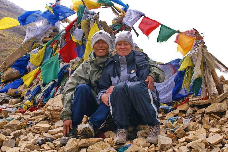 05. 06. 2006 ...Wir kommen an Sipsip (4320 m) vorbei zu einem riesigem Felsbrocken. Es folgt ein schlammiger, vor kurzem noch mit Schnee bedeckter Erdhang, der sich 200 m hinauf zieht, nur auf den seitlichen Bergen ist Schnee zu sehen. Wir haben Glück, nach 470 Aufstiegsmetern in 1,5 Std. erreichen wir in 4480 m Höhe den Pass Nara La, am großen mit Gebetsfahnen und -schals geschmückten Steinhaufen ruhen wir uns aus, genießen den Rückblick und vor allem den fast wolkenfreien Ausblick auf die tibetische Hochebene mit seinen hohen Bergen, die grünen Gerstenfelder vom Grenzort Sera und das wieder zu uns stoßende Humla Karnali Tal. Der steile Abstieg war erst vor 2 Tagen gefährlich vereist. Yakkarawanen, begleitet von Pferden und fröhlichen Menschen kommen uns aus Tibet entgegen. Wir gehen links hinunter auf unscheinbaren Geröllwegen, die zukünftige Straße führt in langen Serpentinen durch die kahlen Berghänge über uns. Sanga mit seinem weißen Kopftuch voran singt uns ein nepalesisches Lied, ermahnt uns, in den steilen Gerölltälern nicht stehen zu bleiben und die Augen nach oben offen zu halten, wir können entfernt einige kleinere Geröllabgänge beobachten. Der Abstieg (19 Meter pro Minute) geht in die Beine, wir nehmen den leichteren unteren Pfad, er windet sich in ca. 3970 m Höhe in Uhrzeigerrichtung um die Berghänge herum. Der 150 Meter höhere kürzere Weg ist an einigen Stellen von Erdrutschen, die nur schwer umgangen werden können, blockiert. In den Canyons ist es sehr heiß und trocken. Der Weg nimmt noch einen letzten steilen Aufschwung, führt dann staubig ins Tal hinunter ans linke Ufer des Humla Karnali. Es ist dann noch ein Spaziergang von wenigen Minuten am Fluss entlang nach Hilsa (3660 m). Hier liegt eine spürbar unangenehme knisternde Spannung in der Luft, von weitem schon erkennen wir den Grund, die leuchtend rote Fahne der Maoisten ist an der Grenzbrücke angebracht. An ihrem arroganten Auftreten, teilweise an ihrer Kleidung erkennen wir einige von ihnen, sie tragen gute Anzüge, gefleckte chinesische Armeeuniformen und stellen offen ihre Waffen, Pistolen und Gewehre zur Schau. Gerade auch die blutjungen Frauen der Maoisten sind sehr von ihrer Sache überzeugt, tragen Uniformteile und chinesische Armeemützen. Wir ruhen uns auf der Campwiese am Flussufer an einem Lodgehotel aus, nach einiger Zeit schlendern acht Maoisten lässig zu uns heran, darunter ein chinesischer Offizier in Zivil mit fiesem Gesicht, den wir am nächsten Morgen an der Grenzstation in China wiedersehen. Sie mustern uns mit herausfordernden Blicken, betatschen unsere Sachen, die Zelte, unsere Wanderstöcke, zwei fragen uns, ob wir aus Simikot kommen und zum Kailash wollen, Witz antwortet einsilbig: nichts verstehen...Wir lassen uns natürlich nicht provozieren, lächeln die Leute an, wenn auch sicher etwas gequält. Sie rücken bald wieder ab. Am Fluss wasche ich mir Haare und Oberkörper, wir laufen schon mal probehalber über die große Hängebrücke ans andere Ufer, mit Fotos halten wir uns zurück, die Maoisten möchten nicht abgelichtet werden, schlechtes Gewissen? Vor der Lodge lassen sich einige Dorfschönheiten sehen, Sanga ist ganz aus dem Häuschen, endlich bessert sich auch unsere Laune, die Maos werden wir schon in den Griff kriegen, was? Zum Abendessen erscheint dann der langerwartete Handlanger des Maoistischen Bheri-Karnali Autonomous Republican Government, wie sie sich selbst stolz bezeichnen. Eiskalt serviere ich ihn ab und bestelle ihn für morgen zum Frühstück wieder, betreten zieht er davon. So habe ich noch etwas Zeit, mir Argumente gegen die 100 Dollar Raubritterzoll einfallen zu lassen, nützen wird es freilich nichts. + 595 / - 950 m in 5,5 Std. (1 Std. Pause) |