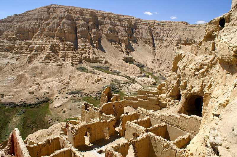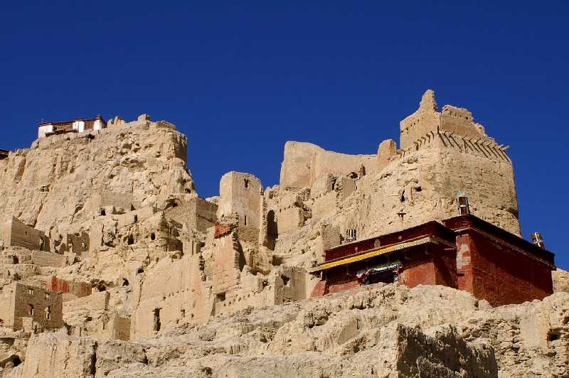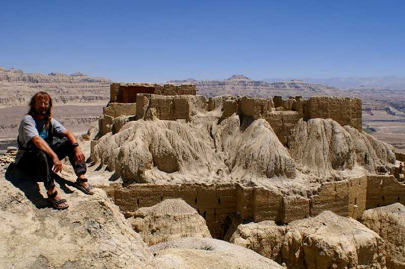09. 06. 2006 ...Guge entstand nach der Spaltung der Tubo Dynastie im 9. Jahrhundert. Nachdem der letzte König Lang Darma starb, begann die Königsfamilie sich um den Thron zu streiten. Gyide Nyimagun, der Nachkomme Lang Darmas, teilte Ngari in drei Teile und gab jedem seiner drei Söhne ein Stück. Das Königreich Guge wurde dann von Dezogun, dem dritten Sohn von Gyide Nyimagun regiert, die Herrschaft seiner Familie dauerte 700 Jahre, dann wurde alles in einem Krieg zerstört. Während ihrer Blütezeit im 11. Jahrhundert waren Tholing und Tsaparang die wichtigsten Städte in Tibet. Insgesamt regierten das starke und mächtige Guge 16 Könige und die Burg war vom 10. bis zum 16. Jahrhundert ständig geprägt von Neubauten. Schon von weitem sehen wir den 300 m hohen Berg mit seiner Grundfläche von 180.000 m², mit seinen Klöstern, dem Palast auf dem Gipfel, den über 300 Wohnhöhlen und ehemaligen schäbigen Hütten, den eingefallen Mauern später erbauter Gebäude überall am Berg. Früher lebten einmal 6500 Menschen hier, zuerst in Höhlen, später wurden dann auch Häuser auf dem Berg errichtet. Aber die Zerstörungswut der Rot-Chinesen ging nicht spurlos an diesen Mauern vorrüber. Einiges ist inzwischen wieder von Spenden aus der Bevölkerung Tibets wiederaufgebaut. Wir beginnen unsere Besichtigung, nachdem wir im Büro 106 Yuan Eintritt bezahlt haben. Der erste Klostertempel ist die Kapelle des Präfekten mit Wandmalereien aus dem 16 Jahrhundert, auf denen Sakyamuni flankiert von Atisha und Tsongkhapa zu sehen sind. Im zweiten Gebäude, dem Lhakhang Karpo oder Weißen Kapelle sind die meisten der 22 großen Buddhastatuen zerstört, einige wenige kleinere Statuen sind noch vorhanden, hier drin haben die Chinesen besonders gewütet. Hier sind die ältesten Malereien von Tsaparang zu sehen. In den Wänden sind kleine runde Steine eingelassen, auf denen kleine Buddhas sitzen. Am Eingang steht Vajrapani, ein 5 m großer blauer Wüterich, ein Beschützer und Wächter, ihm gegenüber der nicht minder schreckliche rote Hayagriva. Dieser Tempel ist der bedeutendste in Westtibet. Am dritten Tempel, dem 30 Jahre vor der Weißen Kapelle 1470 errichteten Lhakhang Marpo oder Roten Kapelle öffnet sich uns eine schöne Naturholztür, wir sehen mehrere Stupas und die Wandmalereien, die 1630 kurz vor dem Untergang von Guge erneuert wurden, sind hier sehr gut erhalten. Der kleinere Yamantaka Lhakang Tempel liegt noch einige Stufen oberhalb, alle Statuen auch hier zerstört, die Murals neueren Datums und in schlechter Qualität gezeichnet. Von den vier Tempeln führt ein in den Fels gehauener unterirdischer Treppenaufgang nach oben zum restaurierten Sommer-Königspalast. Seine Zimmer sind leer, vom Balkon am Nordende haben wir einen wundervollen Ausblick über Tsaparang und die herrlich zerklüfteten Bergtäler der Umgebung, die aus einer Art sandigem Lehm oder lehmiger Erde bestehen. Die Erosion zauberte dabei herrlich bizarre Gebilde und Figuren in die Natur. Der Rote Mandala Lhakhang Palast auf der Bergmitte beherbergt ein schönes dreidimensionales Mandala, ist aber leider geschlossen. Wir steigen auf einer Treppe 30 m im Felsen steil nach unten, betreten den Winterpalast, der aus einem niedrigen Höhlensystem besteht, wir müssen gebückt durch die Gänge huschen. Tauben nisten in den Höhlen. Wieder oben, betreten wir die nach oben offene Versammlungshalle, hier wurde auch das Wasser bei Regen gesammelt und in einem Sammelbecken gespeichert. Auf der Spitze des Königsberges ruhen wir uns aus, genießen die Rundsicht und machen Fotos. Zurück fahren wir links herum eine kurze andere Strecke, bevor wir wieder auf unsere alte Route zurückkehren. Wir erhalten eine Ansichtskarte von Guge, die wir an unsere Tochter Marie schicken, versehen mit allen Unterschriften unserer Begleiter, leider wird sie nicht ankommen, da sie nur eine aufgedruckte 0,80 Yuan-Marke hat, 4,50 müssten es sein. Schade vor allem, da Phadindra, der uns beim Guge-Besuch begleitet, auch erstmalig eine Karte an seine Familie daheim schickt. Beim abendlichen Rundgang in Tholing erwerben wir eine große Gebetsfahnenkette, sauber mit kräftigem Gurtband vernäht, wir werden sie später am Mount Kailsh auf dem Drölma Pass für die Götter festbinden. Ansichtskarten gibt es bis Lhasa in keinem Ort zu kaufen, wir erfahren erst dort die richtigen Portokosten. Zum Abendessen 20 Uhr 30 erläutert uns Sanga die Bedeutung der Namen von Dorje - Weisheit kombiniert mit Manneskraft. Phadindra bedeutet Regenbogen nach einem kleinen Regen. Sanga wird von seiner Familie Sangé genannt, der Name bedeutet Sternchen, oder eine Zacke von Shivas Dreizack oder eine Einheit von Mönchen. Abends lade ich unsere drei Nepalesen und drei Tibeter ein in eine tibetische Disko, wir sind die einzigen Gäste. Der Saal ist in Dunkelrot gehalten mit tibetischen Motiven und Fähnchen, der Fußboden mit roten Teppichen ausgelegt, wir sitzen an kleinen Lacktischchen auf Sitzbänken. Die Musik ist meist folkloristisch tibetisch, nepalesisch oder indisch, teilweise etwas tekkno-angehaucht. Tanzgruppen tummeln sich auf bunten Naturwiesen im großen Fernseher. Wir trinken Lhasa-Bierdosen aus kleinen Schnapsgläschen, es wird immer randvoll geschänkt und die hübsche Kellnerin gibt uns die Gläser in die Hand, animiert uns zum Trinken. Für die 20 Bierbüchsen bezahle ich 115 Yuan (12 Euro). Ab null Uhr läuft das Eröffnungs-Fußballspiel Deutschland gegen Costa Rica (4:2 für uns) der Weltmeisterschaft in Deutschland, Sanga schaut es mit uns an. Es wird eine kurze Nacht.