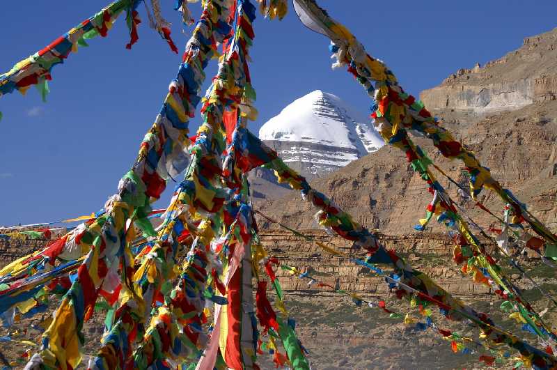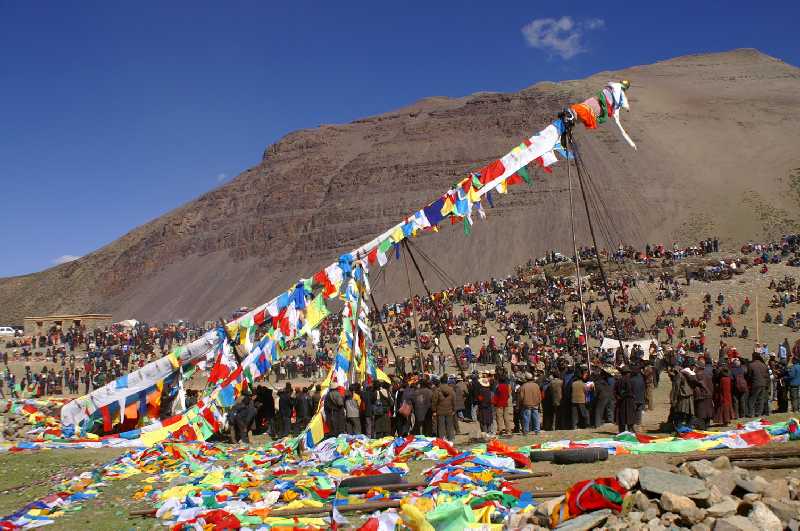 11. 06. 2006 ...9 Uhr 45 begeben wir uns auf den Festplatz, laufen inmitten vieler Pilger die drei vorgeschriebenen Runden in Uhrzeigerrichtung um die halbaufgerichtete bunte Fahnenstange. Die Pilger beten und werfen „Windpferde“ (kleine farbige Papierstücke mit buddhistischen Heiligen Schriften darauf) in die Luft. Sie helfen bereits am Vortag, die Gebetsflaggen des letzten Jahres zu entfernen und neue anzubringen. Entlang der Seiten auf den Hängen der nahegelegenen Hügeln sitzen viele Leute, um das Spektakel zu beobachten, Es beginnt mit dem Einmarsch der festlich geschmückten rotgewandeten Mönche aus den umliegenden Klöstern, die sich oberhalb der Fahnenstange auf ihren Gebetsteppichen niederlassen, dicht umlagert von den Pilgern und den neugierig ungeniert fotografierenden europäischen, japanischen und amerikanischen Touristen. Den Mönchen nähern sich ehrfurchtsvoll die Pilger, bringen dem Hauptlama kleine Gaben, Schals, Geld oder Getränke, bitten ihn, für ihre Zukunft zu beten und werden von ihm mit einer kleinen Vajraglocke am Kopf gesegnet. Andere Mönche musizieren mit langen Blasinstrumenten und Glöckchen. Ab und zu wehen kleinere Wirbelstürme die Tausenden Windpferde und viel Staub hoch in die Luft. Dann beginnt die Zeremonie der Aufrichtung der Tarbocher Fahnenstange. Sie wird zuerst mit Hilfe von langen A-förmigen Holz- und Eisenstangen und Seilen halb aufgerichtet. Ein orangebekleideter Lama gibt ständig Anweisungen mit einem Megaphon, was zu tun ist, wenn man stehenbleiben kann, und wann man weitergehen muss. Jeder kann helfen, die Seile zu ziehen und die Stangen aufzurichten, das ist der „nicht organisierte“ Teil der Zeremonie, es gibt immer reichlich Leute, die spontan mithelfen. Wenn es zu schwer wird mit den Stangen, wird eine Pause für eine halbe Stunde eingelegt. Der Lama legt eine lange Aluleiter an und klettert hinauf, oben knüpft er zwei Seile um den Fahnenmast. Dann kommt der letzte Teil, der letzte Schritt, der zur perfekten aufrechten Position der Fahnenstange führen muss.Die zwei starken Seile werden an zwei Lastwagen befestigt, die Motoren sind warm gelaufen und dann auf das Zeichen des Lama fahren sie rückwärts, die Fahnenstange richtet sich auf. Um die Bewegung zu kontrollieren, stehen beidseitig Menschen, die ebenfalls an den Seilen ziehen, dass sie nicht auf die eine oder andere Seite fallen kann. Schließlich beginnen sich die Lastwagen zu bewegen, es geht alles sehr schnell, die Fahnenstange bewegt sich, die langen Stangen, die sie gestützt haben, fallen herab und nur Sekunden später ist alles vorbei. Jetzt beginnt der große Zauber, die Fahnenstange steht senkrecht gerade, Tausende von Windpferden fliegen in den Himmel ... wie eine Explosion von Gebeten, die in den Himmel gehen. Mir kommen die Tränen, ich kann wirklich fühlen, wie ein plötzlicher großer Moment des Glücks mich umgibt. Wie berauscht bleibe ich eine ganze Weile auf meinem Platz auf dem Hang hocken. Im nächsten Moment beginnen die Menschen wieder mit der Umrundung der Fahne, dieses Mal, um sich zu versichern, ihre Arbeit gut gemacht zu haben und das alles wohlauf ist. Wir nehmen teil an ihrer Euphorie. Große Steine werden wieder kreisrund um die Fahnenstange aufgestapelt. Die große indische Pilgergruppe samt ihrem Guru macht lautstark mit ihren Gebeten und einer Tänzerin auf sich aufmerksam. Die tibetischen Mönchsgesandten werden in den Kreis der Inder eingelassen und setzen sich zu ihnen. Der Absperrkreis der eigentlich überflüssigen chinesischen Soldaten wird mit einem Fahnenappell aufgelöst und sie ziehen sich in das chinesische Lager zurück, aus dem bald aus zwei großen Lautsprechern eine freche laute chinesische Frauenstimme rote Propagandaparolen nonstop über den Platz mit den feiernden Indern schallen läßt, diese teilweise übertönend. Höchst beschämend, finde ich. Oberhalb auf einem Hügel wurde auch ein kleiner Mast mit vielen Gebetsfahnen errichtet, ein Abbild des großen Bruders. Einige Stunden später ist der Platz wieder leer, außer den entfernt stehenden Zelten der Menschen, die die Nacht hier verbringen werden, sei es, um am nächsten Tag heimzukehren oder die Kailash Parikrama, die Heilige Kailash-Umrundung zu gehen. Viele Pilger starten heute nachmittag schon die Kora. Ich bin glücklich, dabei sein zu dürfen bei diesem einmaligen mächtigen Erlebnis. Auf dem Rückweg zu unseren Zelten begegne ich auch der österreichischen Gruppe von Niru, es sind neun Touristen, die Führer sind Ganesh, der kleine immer strahlend freundliche Sere und unser Pasang, der Koch der junge Bijaja, der zweite Koch unser Purna vom Shivapuri-Trek, sofort bekomme ich heißen Orangensaft, zwei aufgeschnittene Orangenhälften und zwei Zimtrollen angeboten, Gastfreundschaft wird bei Niru groß geschrieben. Wir werden die Österreicher und ihre Begleiter in den nächsten Tagen bis nach Saga öfter sehen. Es ist erst früher Nachmittag, wir bekommen eine leichte Suppe und haben anschließend einige freie Zeit, die wir mit einer Runde Kniffel verkürzen. Wir unternehmen am frühen Abend eine zweieinhalbstündige Wanderung über die Zeltplatzwiese Richtung Kailash, es gibt hier massig Erdhöhlen der großen Jack-Kaninchen, an zwei Stupas suchen wir einen Weg rechts hoch zu einer Höhle in den Felsen, von hier traversieren wir nach rechts unterhalb des hohen Felsenbandes bis zu einer Art Steinstupa, finden dort den Durchgang hoch auf den Platz der Himmelsbestattung. Iris findet oben eine Brieftasche mit ca. 600 Yuan, sagt unseren Führern darüber Bescheid. Da sich aber niemand meldet, spendet sie das Geld nach und nach für gemeinsame Ausgaben, z. B. die Abschiedsgetränke in Saga. Von unserer Matratzenaussicht beobachten wir, dass am Fahnenmast noch viele dicke Gebetskettenwürste am Boden liegen, von Helfern entwirrt und über dem Platz einzeln aufgespannt werden, eine Heidenarbeit, die noch mehrere Tage dauert. Aus dem Weihrauchkessel steigen immer no