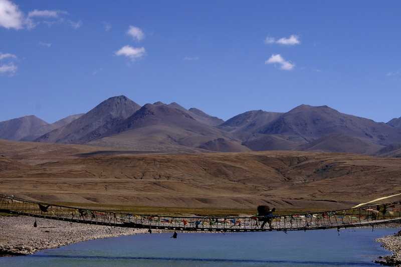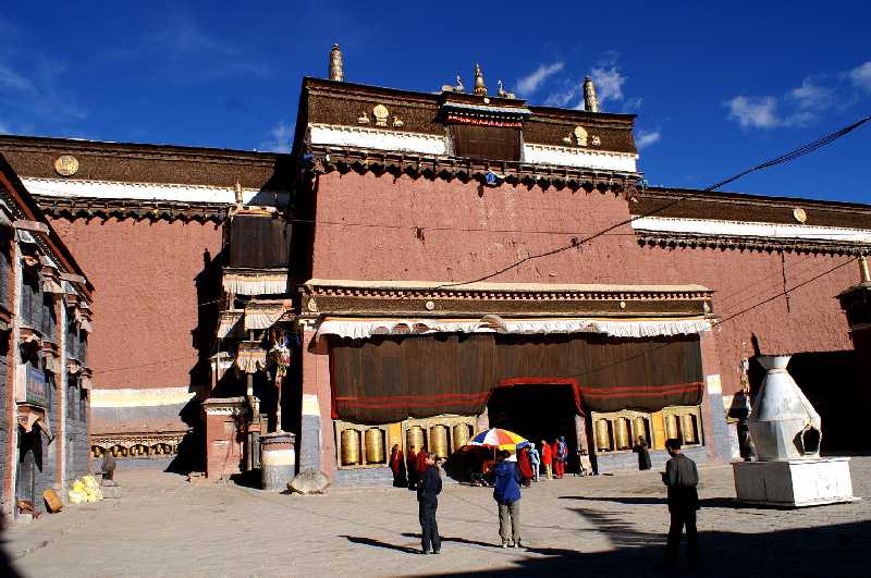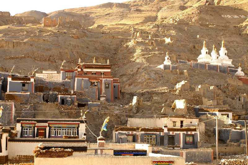 17. 06. 2006 ...Es geht über den 4890 m hohen Kur La Pass, im Rücken sehen wir immer noch den weißen Chomo Uchong. In Sangsang (4450 m) machen wir nach 190 km eine Stunde Mittag vor einem Teehaus auf der Wiese unter einem Sonnenschirm, bekommen Buttertee und Nudelsuppe. Es ist hier sehr heiß hier. Vorher kommen wir noch über den Gye La Pass (4900 m), fahren durch ein enges wildes Felsental und über den Sang La Pass (4760 m). Fast die gesamte Strecke ist heute von Baustellen durchzogen, auch auf den Pässen arbeiten die Straßenbaubrigaden, teilweise sind kleine Umleitungen durch Bäche oder Senken zu fahren, oder unser geduldiger Fahrer Pasang muss vor einem Riesenlaster zurückweichen, es kostet uns viel Zeit, aber davon haben wir ja genug. Nach Sangsang kommt der Ka La Pass (4650 m), der Kyi Trang La Pass (4420 m) und der Pang La Pass (4530 m). Nach diesem sind auf der linken Seite drei Klöster zu sehen, Meditationshäuser für Guru Rinpoche oder Padmasambhava. Eine davon ist direkt in die Felswand gehauen. Auch Stupas sind zu sehen, eine ganz vergoldet, die wie ein Schornstein aussieht. Wir erreichen den großen Ngamring See (4260 m) mit der in der Ferne am Ufer liegenden gleichnamigen Ortschaft, ringsum sind jetzt Getreide-Felder zu sehen, auch eine Burg ist dort zu erkennen. Am Abzweig nach Ngamring liegt der saubere kleine Ort Gekha, ein Stück Asphaltstraße und eine neue Tankstelle weisen auf den chinesischen Fortschritt hin. Der siebente und letzte Pass ist der Gang La (4430 m), danach rechts der Lang Tso See. Nach 300 km erreichen wir auf 4000 m die ersten Vororte von New Lhatse, es ist jetzt 17 Uhr, die Staubpiste hat sich in eine aalglatte Teerstraße verwandelt. Wir kreuzen die Abzweigung, die von Nepal, Nyalam und Tingri heraufführt, 2001 sind wir schon mal hier gewesen, fahren aber morgen die andere, nördliche Strecke nach Shigatse weiter, da diese südliche Strecke über die Berge gesperrt wegen Bauarbeiten ist. Nach kurzem Tankstop in Lhatse fahren wir auf neuer Straße weiter Richtung Shigatse bis zu einer Straßensperre, an der Pasang seinen Führerschein hinterlegen muss, sodass wir morgen wieder nach Lhatse zurückmüssen, um die Nordroute zu fahren. Die Wallfahrtstraße ist fertig asphaltiert bis hoch nach Sakya, das 25 km vom Abzweig Trengdzom in südlicher Richtung liegt. Nach 360 km erreichen wir den Pilgerort mit dem berühmten Sakya Kloster (4250 m). Ringsum sind neue Hotels und Gasthäuser aus dem Boden gestampft worden, wir quartieren uns ein im Sakya-Hotel im ersten Stock, das Zimmer kostet 280 Yuan (30 Euro) und ist luxuriös ausgestattet, das Bad in dezentem Schwarz gehalten. Iris und Witz bekommen ab jetzt immer Einzelzimmer. Mit Witz laufe ich noch eine Runde in der untergehenden Sonne zur Nordseite der auf dem Berghang liegenden kleineren Klostergebäude.