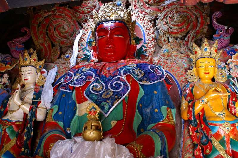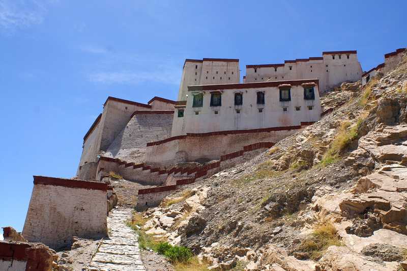 19. 06. 2006 ...Man kann aber nur mit viel Zeit und mehreren Besuchen die ganzen Sehenswürdigkeiten mitbekommen. Wir sehen die mit 26 m weltweit größte Metallstatue aus vergoldetem Kupfer, die des Buddhas Maitreya. Die 70.000 m² beherbergen zahlreiche Reliquien, die von den Chinesen weitgehend verschont wurden. Am großen weißen Gebäude oben am Berg werden zu tibetischen Feierlichkeiten große Thankas entrollt. In diesem Kloster lebten zur Zeit des 5. Panchen Lama 6000 Mönche, heute 350, darunter sind auch Undercover-Mönche als Zuträger für die chinesische Staatssicherheit tätig. Mönch werden ist in China nicht mehr so einfach, man muss einen schriftlichen Antrag stellen und eine staatliche Parteiorganisation untersucht dann die Familiengeschichte des Antragstellers, bei dunklen politischen Punkten auch in der Verwandtschaft darf der Sohn oder die Tochter nicht in ein Kloster eintreten. Fahrt nach Gyantse 11 Uhr beginnt die Fahrt Richtung Gyantse, Pasang legt heiße tibetische Kassettenrhythmen ein, Gyaltsen sitzt jetzt immer ganz hinten, da die Verkehrspolizei vorn nur zwei Personen erlaubt. Die Straße ist ebenfalls neu und auf hohen Dämmen vor Überschwemmungen gesichert, ich denke zurück an 2001, als wir für die 96 km ganze 12 Stunden brauchten. Neben der Straße grünen die Gersten- und Weizenfelder, viele Bauerngrundstücke stehen am Wegesrand. Am Kilometerstein 71,5 auf der linken Seite Richtung Shigatse steht Gyaltsens Eltern- und Geburtshaus, bewohnt von seinem ältesten Bruder (49) dessen Frau und Kindern, er selbst wohnt ja jetzt in Lhasa. Er lädt uns zu einem Besuch ein, wir laufen über schmale Pfade zwischen den bewässerten Feldern links zu einem großen mauerumschlossenen großen einstöckigen tibetischen Haus, hinter einem anderen Grundstück versteckt. Im Hof Pferde, Kühe und Schafe, im kalten tibetischen Winter bewohnen die Tiere das Erdgeschoss. Nach oben führt eine steile Holztreppe ins Wohnzimmer mit Katze und für offiziellen chinesischen Kontroll-Besuch pappt das obligatorische Mao- und Regierungs-Betonköpfe-Plakat an der Wand. Die Küche mit großem Ofen wird nur im Sommer genutzt, gekocht und geheizt wird mit Yakdung, der in großer Anzahl rund geformt außen an den Hof- und Hausmauern klebt. Wir bekommen von der Hausherrin wunderbaren sahnigen Buttertee und selbstgebrauten gelben Chang, eine Art Gerstenbier, nicht jeder versteht sich darauf, einen guten Chang herzustellen, dieser hier ist echt gut. Wer guten Chang bereitet, ist auch aus verständlichem Grund bei allen Nachbarn sehr beliebt. Das Haus wird laufend vergrößert, zur Zeit wird an einem Gästezimmer gearbeitet, die Schränke werden gleich hier geschreinert, die Deckenbalken und Möbel auf tibetische Art bunt bemalt. Ein reich geschmückter Hausaltar wird uns aufgeschlossen, sogar Dalai Lama-Bilder stehen dort neben den kleinen Buddha-Statuen, die beim oben genannten Besuch allerdings verschwinden müssen. Von uns kommen zwei neue Fotos dazu. Einmal erzählt mir Gyaltsen, sein größter Traum wäre ein chinesischer Reisepass, damit würde er als erstes nach Dharamsala in Indien fahren, um den Dalai Lama zu sehen. Leider ist es für normale Tibeter nur schwer möglich, einen Pass zu bekommen, man muss dazu reich sein, eine große Familie, große Firma und viele Sicherheiten haben. Seine geheimen Gedanken teilt er nur mit guten Freunden, denen er vertrauen kann, eine Unvorsichtigkeit und seine Lizenz als Touristenführer ist weg. Wir fühlen uns sehr geehrt, dass er uns vertraut. Er hat vier Brüder und eine Schwester, seine Eltern sind beide gestorben. Studiert hat er Lehrer für Mathematik und Englisch. 14 Uhr erreichen wir unser Tibet Gyantse Zongri Hotel in Gyantse (3950 m), bekommen im ersten Stock schöne Zimmer. Im vierten Stock essen wir gemeinsam Mittag a la card, die Küche befindet sich auf dem Hoteldach, das wir gleich für eine Fotosession nutzen. Es ist wieder T-Shirt-Wetter, die Sonne brennt heiß vom Himmel. Endlich Besichtigung des Gyantse Dzong, wir sind bis auf drei Tibeterinnen die einzigen Besucher auf dem 125 m hohen Burgberg. Die Festung wurde 967 vom Nachfahre eines religiösen Königs der Tobo gegründet, umgebaut 1390 von Langchin Puckpu Palsang. Sie war lange Sitz der alten tibetischen Regierung, die hier oben Steuern und Abgaben seiner Untertanen kassierte, ein Gefängnis und Folterkammern hatte. Dies kann man in Museumsräumen ansehen, es gibt lebensgroße Puppen mit Darstellungen der damaligen Gerichtsbarkeit, der Steuereintreibung. 80 % Steuern mussten damals entrichtet werden, wer das nicht konnte, wurde grausamsten Folterungen mit Hände, Füße, Zunge und Nase abschnei-den, Sehnen ausreißen usw. ausgeliefert, wie hier lebensecht zu sehen ist. Am Ende des 19. und zu Beginn des 20. Jahrhunderts war die Festung Schauplatz der dreimo-natigen Verteidigung von Gyantse gegen den englischen Eindringling Younghusband, allerdings konnten sich die schlecht bewaffneten Tibeter nicht gegen seine besseren Feuerwaffen halten, von einem hohen Felsen hinunter stürzten sich etliche tibetische Krieger freiwillig in den Tod. Wir besichtigen den Palast des Religiösen Königs, die Religiöse Versammlungshalle der alten tibetischen Regierung, die Halle der Steuereintreibung. Kulturelle Reliqien sind nur sehr wenig erhalten geblieben. Viele Räume stehen leer. Aber die Aussicht vom Berg ist fantastisch nach allen Richtungen. Wir sehen unser nächstes Ziel, das Pelkor Chöde Kloster mit der einmaligen Khumbum Stupa unter uns liegen, steigen auf einer langen Treppe hinab, laufen auf der Rückseite des Dzong auf der neuen Serpentinen-Autostraße in ein tibetisches Wohnviertel, gelangen durch die Gassen von Gyantse auf die schmale Straße, die uns zum Kloster führt. Hier werden in den Häusern bunte tibetische Teppiche geknüpft. Auf allen Dächern die Bambusstangen mit bunten Gebetsfahnen halten die bösen Dämonen fern vom Haus. Kühe liegen in der Hitze im Schatten der H