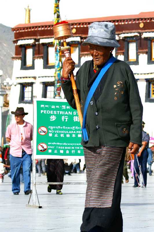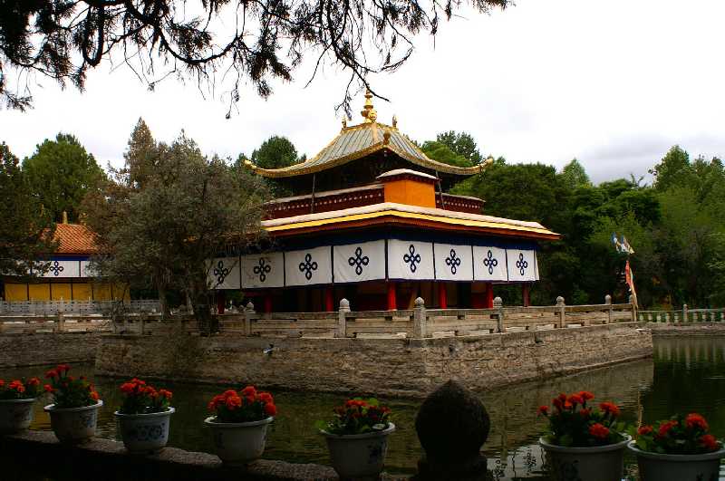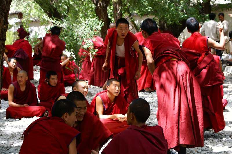 22. 06. 2006 ...Erbaut von 1954 bis 1956, drinnen mehr als 40 Zimmer, an den Wänden in 301 Szenen die religiöse Geschichte Tibets dargestellt. Wir durchqueren sein Empfangszimmer, Studierzimmer, sein Schlafzimmer. Im Arbeitszimmer steht ein riesiges altes Radio aus Indien von 1956, im Meditationsraum steht ein russisches Radio „Mir“ von 1954, der Dalai Lama ist ja damals auch ein großer Technik-Fan gewesen. Im weißen Bad herrlich nostalgische Armaturen, ein riesiger Toilettenspül-kasten, eine komplizierte messingne Dusche, verchromte Knebelwasserhähne über der gefliesten Badewanne. In der Versammlungshalle viele große Statuen und Hunderte kleine aus Bronze, ebenso Buddhapuppen. Später sehen wir auf dem Dach eines anderen Hauses viele tibetische junge Leute einen Arbeitstanz mit Stampfern aufführen, wie er auch auf dem Jokhang Tempel öfter stattfindet. Im Kunstgewerbehof, wo es wertvolle echte Antiquitäten teuer zu kaufen gibt, spielen und tanzen zwei Verkäufer für uns und bekommen ein kleines Trinkgeld dafür. Inzwischen regnet es ziemlich stark, wir verlassen den Sommerpalast und treffen am Fuß der Potala Iris und Gyaltsen. Er erzählt, dass in der Stadt Lhasa ca. 200.000 Menschen leben, mit Vororten eine halbe Million. Nach einer Stunde Ruhepause im Hotel setzen wir uns auf die Dachterrasse des nepalesichen Mandala Restaurant am Barkhor zum Mittagessen. Die Aussicht auf Menschen und Stadt ist vom Feinsten. Anschließend fahren wir zum Sera Kloster, um die Debatte der Mönche zu erleben. Gegründet wurde es 1419 von Jamchen Choje Shakya Yeshe, einem Schüler Tsongkhapas, hat eine Versammlungshalle, drei Schulen und über 33 Häuser und liegt auf einer Fläche von 155.000 m², ist bekannt als eine der drei Hauptklöster der Gelugpa-Sekte in Zentraltibet. 5500 Mönche waren es, 200 sind es jetzt, inklusive der Hausangestellten. 15 Uhr beginnt die Debatte, ca. 200 Mönche stehen und sitzen dabei im Hof und schulen in Streitgesprächen ihre Schlagfertigkeit, mit Worten, Argumenten und Gegenargumenten ihre Gegner unterzukriegen und die Oberhand zu gewinnen. Dabei klatschen sie in die Hände und gestikulieren wild herum. Sehr interessant, es sind aber auch etliche Touris anwesend, die sich das Spektakel auf Film bannen. Nachmittags treffen wir uns zum gemeinsamen Foto gegenüber der Potala mit unserem Mr. Fotographer Witz. Abends gehe ich allein nochmal zum Jokhang Tempel, genieße auf dem Balkon lange den Abschied von Lhasa und seinen liebenswerten Bewohnern. Die für heute geplante Trekkingtour auf einen kleinen Berg in Lhasa, evtl. Richtung Gephel Ri (5240 m) oberhalb des Drepung Klosters mit 100 km Rundumsicht muss leider ausfallen, da alles in dicken Wolken war und auch ein kräftiger Regen dagegen sprach. 19 Uhr treffen wir uns mit Sherrap, dem Chef unserer tibetischen Trekkingfirma, er lädt uns zum Lhasa-Abschiedsdinner in ein chinesisches Gourmet-Restaurant ein im chinesischen Viertel der Stadt. Ein 33-jähriger quicklebendiger gutgelaunter lustiger optimistischer Mann im T-Shirt mit den Buddha-Augen begrüßt uns, im ersten Stock bekommen wir ein Separé mit einem gläsernen Drehtisch. Die Speisen sind vom Allerfeinsten, es gibt für jeden einen kleinen Teller und ein Schüsselchen, dazu Stäbchen und einen Löffel. Auf die Drehscheibe kommen Kartoffelbrei mit Schnittlauch und Gemüse, scharf gewürzte Tofu-Scheiben, paniertes, schwimmend in Öl gebackenes Schweinegeschnetzeltes, eingelegt in eine scharfe rote Sauße, gebratene kleine Schweinsrippchen, gebratenes Hühnchen ohne Knochen, angemacht mit gerösteten Erdnüssen in feiner Sauße, eine feine gemischte Pilzsuppe mit Meeresfrüchten auf Spiritusbrennern, dünne gedünstete Fenchelstengel, grob gehackter Spinat. Dazu gibt es Lhasa-Weizenbier. Sherrap erzählt einige Schwänke von Trekkingtouren, dass die Inder bei den Einheimischen am Kailash sehr unbeliebt, die Europäer dagegen gut angesehen sind, eine 70-jährige Frau trug er schonmal im Tragekorb auf dem Rücken vom Pass herunter. Von unerfahrenen 20-jährigen Engländern mit Riesenkraxen, die im Tiefschnee nicht mehr weiterkonnten und die er ebenfalls runterbringen musste samt Gepäck, erzählt er. Heute vor einer Woche war wieder so hoher Schnee am Kailash, dass von 50 Touristen 30 wieder umkehren mussten und das Ende Juni. Insgeheim merken wir wieder einmal, dass wir auf unserer Reise wirklich Glück mit dem Wetter und unserer Planung hatten.