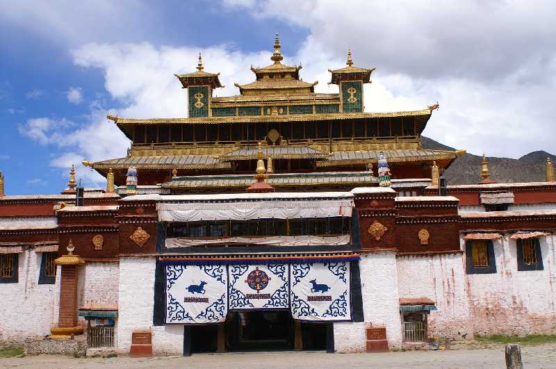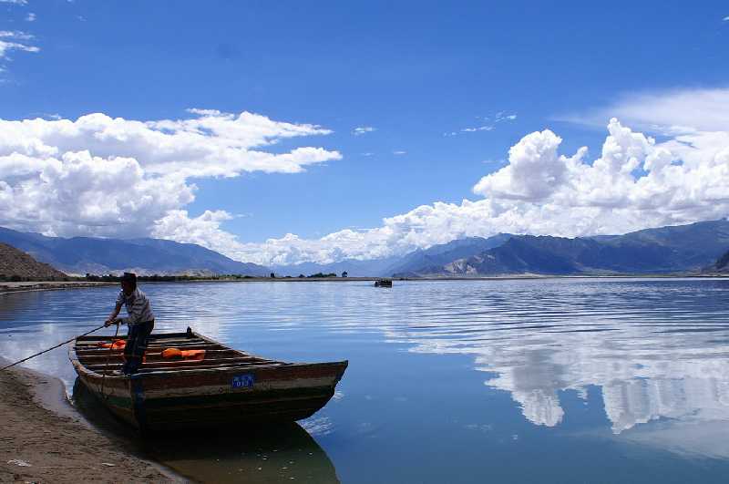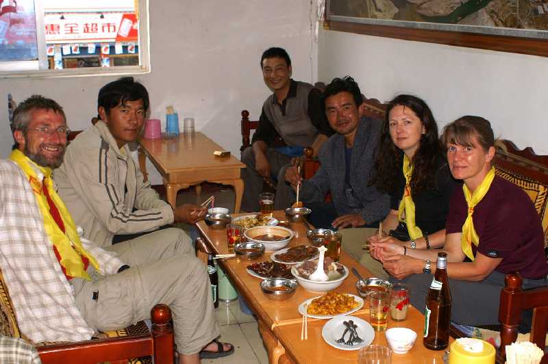23. 06. 2006 ...Im Sommer erfordert es einiges Geschick, das Boot durch die ständig wechselnden Untiefen des Flusses sicher ans andere Ufer zu bringen. Unterwegs steigen wir um auf ein gut gefülltes Boot, sodass wir jetzt über 50 Personen, meist Schulkinder, einigen Erwachsenem, und ein Motorrad sind. Wir fahren eine ganze Strecke stromaufwärts, erreichen dann nach 1,5 Std das andere Ufer weit oberhalb. Auf dem Rücksitz eines alten Jeeps fahren wir in 20 Minuten über schmale sandige Hoppelpisten bis in den von der hohen kreisrunden Mauer umschlossenen Hof des Samye Klosters. Samye ist Tibets allererstes Kloster, die Quelle des tibetischen Buddhismus und seine Geschichte reichen über 1250 Jahre zurück. Gegründet wurde es unter der Herrschaft vom 38. König der Tubo Dynastie Trisong Detsen, zwischen 765 und 780, das exakte Jahr ist unbekannt. Die ersten Mönche hier halfen mit bei der Übersetzung der indischen buddhistischen Texte vom Sanskrit ins Tibetische. Früher gab es noch mehrere buddhistische Glaubensrichtungen, die der Sakyapa, der Kagyupa und die der Gelukpa. erst im 15. Jahrhundert gewannen die Regeln der Sakyapa Sekte Oberhand über Samye. Auch wurde das Kloster in seiner Geschichte einige Male zerstört und wiederaufgebaut, die größten Zerstörungen gab es zur „Kulturrevolution“ durch die Chinesen, die meisten Gebäude, eingeschlossen das weltberühmte vergoldete Ütse, das Zentralgebäude, wurden böse verwüstet, die wertvollen Reliquien gestohlen oder vernichtet. 130 Mönche dürfen jetzt hier wieder ihrem Glauben nachgehen, mit Genehmigung der Kommunisten wohlgemerkt, früher waren es 2500. Sakya stellt das Universum Buddhas dar, von oben sieht die Anlage wie ein Mandala aus, die Bauten wurden von astrologischen Gesichtspunkten aus angeordnet und stellen kosmische Dinge, wie Sonne und Mond oder auch Kontinente und Ozeane, sowie auch buddhistische Symbole dar. Vor dem größten Klostergebäude in der Mitte des Mandala stehen zwei originale Steinsäulen, die Schrift darauf ist alttibetisch, zwei steinerne Elefantenfiguren sind ebenfalls aus dem 8. Jahrhundert. Das Haus ist in drei Baustilen errichtet, das Erdgeschoss tibetisch, der erste Stock chinesich und die obere Etage im indischen Stil. Am Eingang hängt eine große Glocke, die erste Glocke in Tibet, die der König von seiner Frau geschenkt bekam. Die vier Ling Kapellen und Chörten in weiß, rot, schwarz und grün stehen im Norden, Süden, Westen und Osten. Östlich neben Samye liegt der Heilige Hepo Ri Berg, wo Guru Rinpoche die Dämonen von Tibet besiegte, es führt ein Fußpfad auf seinen Gipfel, wo eine Kapelle steht. Im Nordosten gibt es die Chim-puk Einsiedelei, Höhlen, in die sich Guru Rinpoche zurückzog, teilweise immer noch von Eremiten bewohnt. Ein Tibeter an einer Nähmaschine, den wir fotografieren wollen, erzählt uns, dass viele gläubige Tibeter sich nicht fotografieren lassen, weil sie denken, dass das Foto später achtlos irgendwo vergessen oder sogar weggeworfen wird. Der Glaube sagt ihnen, dass sie dann krank werden oder sogar sterben. Im Hof des Gästehauses essen wir Mittag, es gibt gebratene Nudeln und Melone als Dessert, schwarzen Tee mit Salz zum Nachspülen. Für alle 6 Personen bezahlen wir 76 Yuan, sehr preiswert. Ab und zu rennt auch mal eine große Ratte während des Essens zwischen unseren Beinen durch. Danach laufen wir die Kora innen an der runden Außenmauer entlang und statten allen Gebäuden noch einen Besuch ab. Auf der Mauer stehen 1028 Stupas, Witz fotografiert jede einzeln von allen Seiten, das ist ein Witz. 16 Uhr 30 fahren wir zurück zur Fähre, lassen uns in der halben Zeit zurück zu unserem treu wartenden Fahrer Pasang übersetzen. Wir fahren zum Gongkar Lhasa Flughafen zurück, checken im Airport Jichang Hotel bei einer sehr unfreundlichen Chinesin ein, wir nehmen heute wieder nur zwei Zimmer, da die Preise hier heftig sind, ein Zimmer kostet 348 Yuan, ist diesen Preis aber nicht wert. Gyaltsen fällt ein Stein vom Herzen, er bedankt sich bei uns. Für Zimmerschlüssel sollen wir je 100 Yuan Pfand bezahlen, nach langer Diskussion ist die Dame bereit, Iris´ Reisepass als Pfand anzunehmen. Das letzte Chinesengeld können daher wie geplant unsere beiden treuen tibetischen Begleiter am Abend zum Abschied bekommen. Gyaltsen lädt uns in ein schönes tibetisches Restaurant ein, gleich vor dem Eingangstor in den Flughafen das letzte Haus links mit der eisernen Wendeltreppe außen. Der symphatische Wirt und seine beiden Frauen sind sehr freundlich und zuvorkommend, sie zaubern uns ein leckeres tibetisches Menü für alle, gekochtes Yakfleisch mit Knochenbrühe und Gemüse, Yakzunge, Momos, gefüllt mit Yak-Hack, scharf gebratene knusprige Schafslunge, sehr lecker, Bratkartoffeln mit Chilli, scharfe Tomatensuppe, Rettichsalat, dazu Buttertee oder Kaffee und Lhasa-Bier. Der Abschied von Gyaltsen und Pasang fällt uns schwer, wir sind Freunde geworden in den letzten 18 Tagen, bedanken uns herzlich für ihre Arbeit, geben ihnen ihr wohlverdientes Trinkgeld, jedem 50 Euro, 10 Dollar und 250 Yuan, umarmen uns noch einmal, winken ihnen dann bei ihrer Abfahrt nach Lhasa. Traurig trotten wir ins Hotel zurück, unsere große Reise neigt sich dem Ende entgegen, ein Lichtblick noch in Kathmandu ist das Wiedersehn mit unseren nepalesischen Freunden.