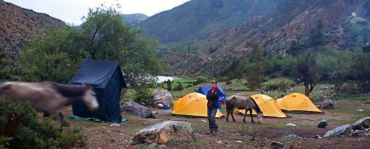 05. 06. Am Morgen einige blaue Fenster am Himmel, wie werden nach den vergangenen Regentagen die Schneeverhältnisse oben am heutigen Pass sein? Eine gewisse Unsicherheit macht sich breit, wir sind auf alles gefasst. Aber dann wird vor unserem Frühstück das Esszelt abgebaut, immer ein sicheres Zeichen für gutes Wetter, die Hoffnung steigt... Der Pfad führt steil aufwärts entlang der Seite des Bergmassives, unterwegs legen wir die warmen Sachen ab, unsere Küchenjungs überholen uns lächelnd, wir erreichen eine Aufstiegsgeschwindigkeit von 6 bis 7 Metern pro Minute, in dieser Höhe ganz gut. Über 4000 m wachsen nur noch Gras und niedriges Wacholder-gestrüpp. Die neue Straße ist in mehreren Höhen grob in die steilen Geröllhänge reingehackt, kein schöner Anblick, teilweise kreuzt sie unser Pfad, der jetzt in einem schmalen steilen Bachtal verläuft. Weiter lesen (und Fotos anschauen) ...