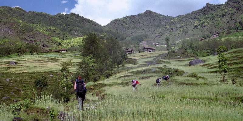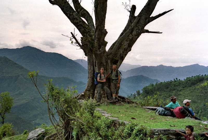 01.05.2003 Ab hier führt eine „Straße“, auf der sogar ab und zu ein Traktor mit Hänger fährt, über Suketar und Taplejung nach Süden Richtung Ilam. Von weitem sehen wir schon den Flugplatz auf der Bergspitze und die großen, europäisch anmutenden Wiesen von Suketar (2300 m). Unser Zeltplatz liegt vor den zwei Lodges auf freier Wiese, direkt vor dem Flugfeld. Damit haben wir alle glücklich unsere Tour überstanden. Alle sind sehr glücklich. Hier gibt es erstmals offiziell Bier zu kaufen, die Armee des Königs hat alles fest im Griff. Abends darf kein Lärm sein, Taschenlampen dürfen nur auf den Boden gerichtet werden, Militärpolizisten kontrollieren die Umgebung, alle Tiere müssen Glocken am Hals haben, auch der Hund unserer Lodge.
