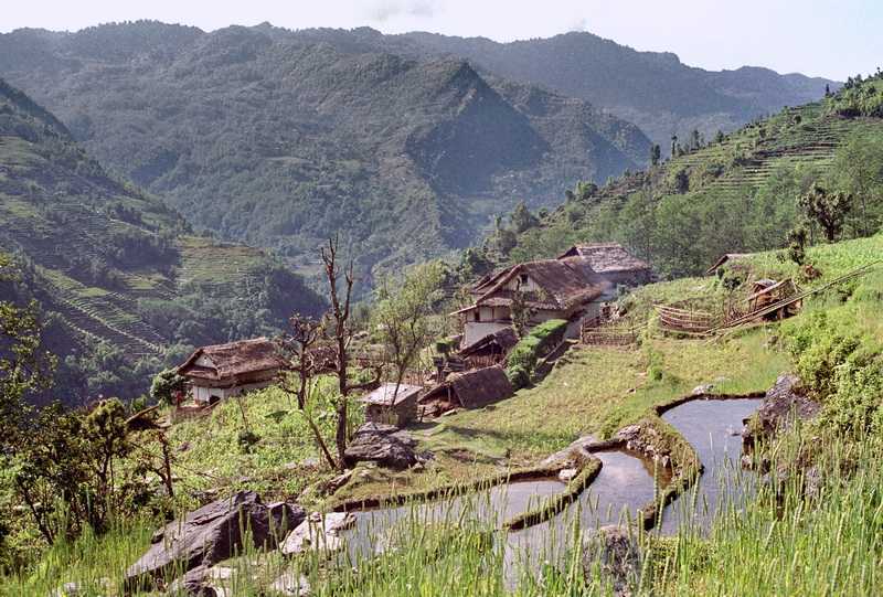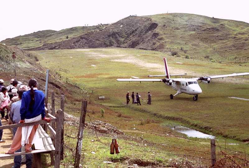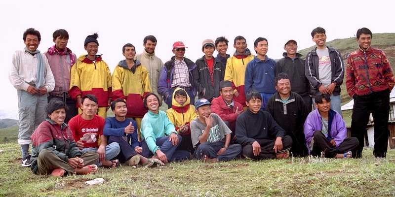 02.05.2003 Das ankommende Flugzeug fliegt erst mehrere Runden, ehe es landet an diesem Tag. Man kann einfach ins Fluggelände reingehen, obwohl Wachen mit alten Gewehren und ein paar Sicherheitsleute mit Funkgeräten rumstehen. Vormittags Fototermin mit all unseren Leuten, außer Satte. Er geht für uns einige hundert Meter tiefer in Taplejung Bananen kaufen, seine Frau hat gestern ihren ersten Sohn verloren bei der Geburt. Er ist deshalb sehr traurig. Abends die Abschiedsfeier mit allen 15 Trägern, den 4 Küchenhelfern, dem Koch Kaman, Niru, Phadindra, Pancha und Bombale. Alle sitzen mit uns gemeinsam auf der Wiese vorm Esszelt. Jeder verzehrt mit der rechten Hand eine Riesenportion Dhal-Bhat und bekommt von Niru Rakshi eingeschenkt. Wir auch. Diesen Anblick werde ich niemals wieder vergessen können: die 15 einfachen, fröhlich lachenden, kleinen Nepalesen, wie sie ihre Riesenportion Dhal-Bhat verdrücken, mir kommen die Tränen und ich muss meine Mütze tief ins Gesicht ziehen und mich wegdrehen, um nicht loszuheulen. An diesen Abend bekomme ich leider auch deswegen von unserem Festessen, gebratenen Kartoffelvierteln, Gemüse und feinem Schweinefleisch nicht viel runter, dafür zuviel vom Rakshi. Anschließend hält Holger eine Dankesrede an unsere Mannschaft und Niru übersetzt. Auch der Trägerchef bedankt sich im Namen aller. Dann verteilen wir unsere Spenden, eingetütet in Papierservietten hat jeder 50 € = 4000 Rs gespendet und so kann jeder Porter 1000 Rs, die Küchenhelfer 1250 Rs, die Guide-Assistenten 1500 Rs, der Koch 2000 Rs und Niru 4000 Rs von uns entgegennehmen. Alle bedanken sich nochmals gegenseitig herzlich. Dann beginnt der musikalische Teil, mit Trommel begleitet singen und tanzen alle nach nepalesischen Liedern, zum Beispiel dem Hit „Resham Firiri“. Nach kurzer Zeit müssen wir die Feier beenden wegen der Armee-Leute, sitzen aber noch stundenlang verzaubert bei Kerzenschein auf der Wiese und gedenken der schönen gemeinsamen Stunden auf unserer Tour mit den lieben, lustigen nepalesischen Freunden, von denen wir nun wahrscheinlich für immer Abschied nehmen müssen.