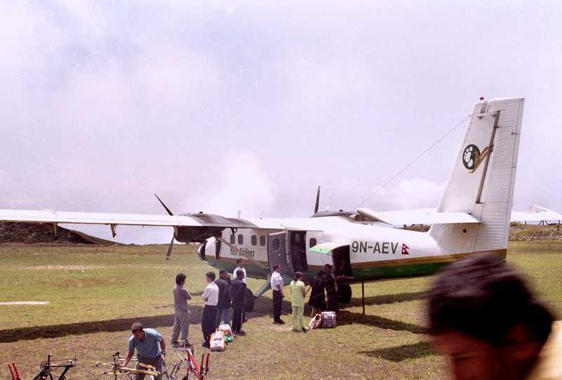 03.05.2003 Ein allerletzter Abschiedsgruß und Einsteigen in die kleine Maschine, zusammen mit Niru sind wir die einzigen Passagiere. Der Flug nach Kathmandu dauert exakt eine Stunde. Wir überfliegen die zahllosen, endlosen grünen Berge und Täler Westnepals. Das halbe Flugzeug bricht den guten Buttertee wieder aus, aber dem Rest geht es gut, und so können wir die grünbraune Berglandschaft mit den vielen Terrassen und Häuschen von oben bewundern. Endlich kommen die ersten Ziegeleien des Kathmandu-Tales in Sicht, sowie Bhaktapur, Ende der Reise.