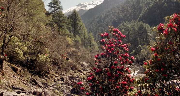09. 04. 6 Uhr Wecken, 7.30 Uhr Abmarsch von Gupha Pokhari durch schöne Rhododendren-Wälder abwärts zum Dorf Gurja Tar (2060 m), dort Lunch, Sicht etwas diesig, der Kansch leider nur zu erahnen. Ab hier beginnt der endlose Abstieg durch schöne Grundstücke und Terrassenfelder mit Weizen, Gerste, Reis, Gemüse und Bananen, vorbei an vielen Bambussträuchern, meterdicken Bäumen, schmucken Häuschen mit bunten Holzgeländern, über eine Hängebrücke in den lebhaften Ort Dobhan (730 m) hinunter auf den umzäunten Zeltplatz „The Hide Out“...