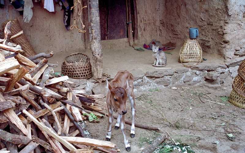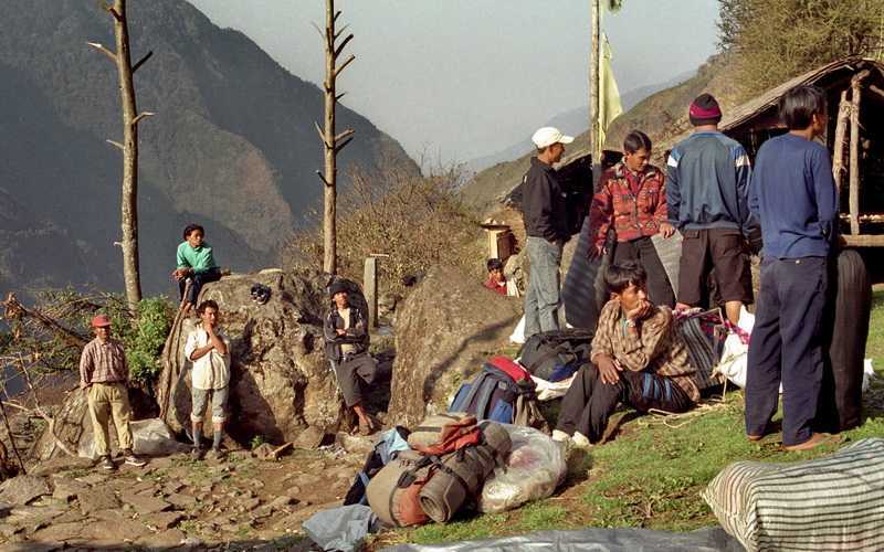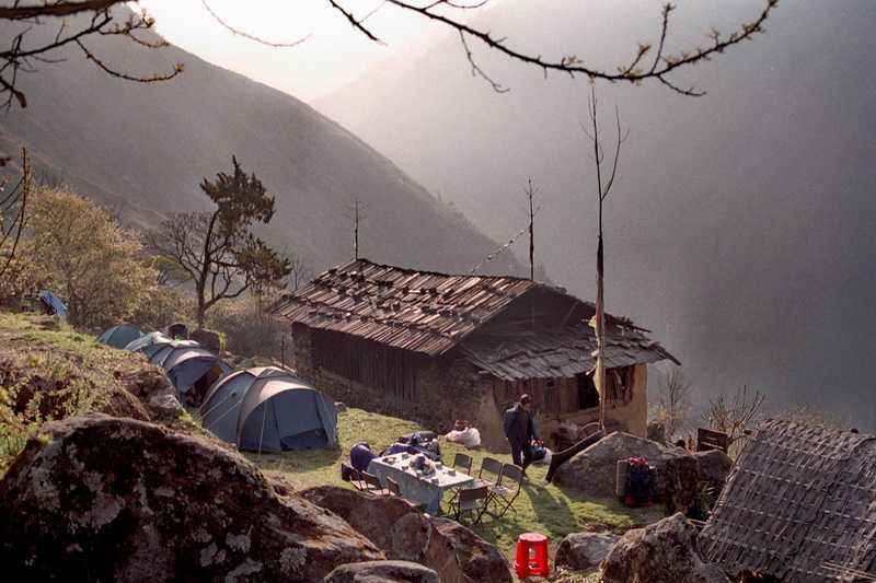 12.04.2003 Lunch in Ghayabari, einem Bauerngut (2015 m). Von hier ein steiler Aufstieg bis auf ca. 2500 m Höhe. Auf dem Hangweg leicht bergauf und -ab, um endlos erscheinende Täler herumgehend und an einem Wasserfall vorbei gelangen wir bis zu den Häusern von Amjilosa (2510 m). Bewirtschaftet wird unsere Lodge, an der wir zelten, von einer jungen Tibeterin, die mit ihrem Kind allein hier lebt, ihr Mann arbeitet in Kathmandu. Kleine Terrassen für unsere Zelte.