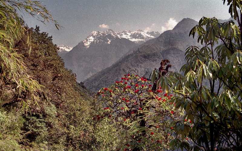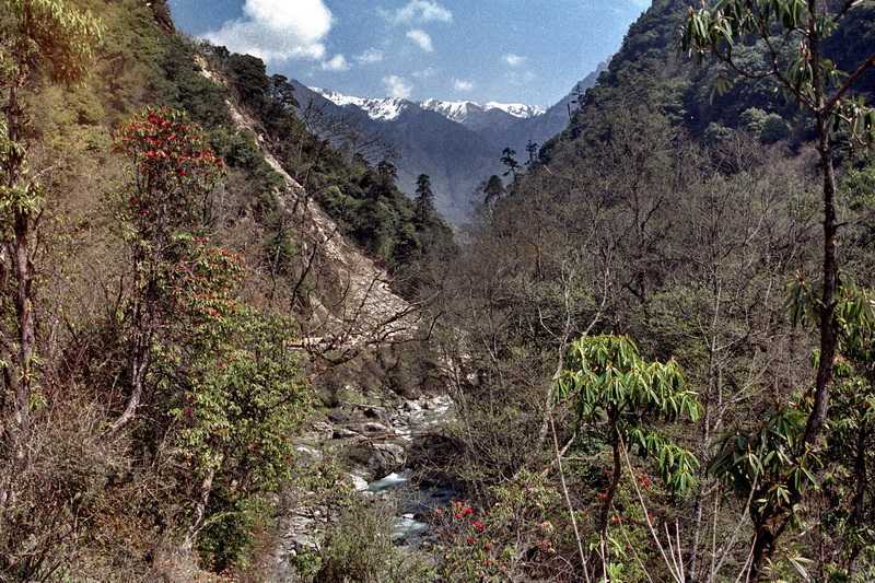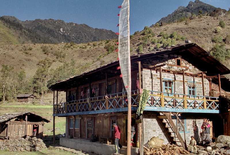 13.04.2003 Ausblick auf den Nango Ma und den Südwest-Teil des Kangchendzönga-Massivs. Heute ist der letzte Tag des Jahres 2059 in Nepal. Abends Regen. Heute bewundere ich erneut unsere fleißige Küchencrew: Sie stehen eine Stunde vor uns auf, bereiten das Frühstück vor, waschen ab. Tisch decken und abräumen nicht vergessen, alles zu Traglasten zusammenpacken, überholen uns irgendwie/ irgendwann vormittags im Laufschritt, fünf Mann lächelnd in einer Reihe. Sie erreichen und errichten den Lunchplatz weit vor uns, alles wieder auspacken, Wasser heranschleppen, Kerosin auffüllen, Kocher in Betrieb nehmen, Essen zubereiten und kochen, Getränke bereiten. Teilweise noch für die Porter (außerhalb bewohnter Gebiete) und sich selbst kochen. Schließlich uns, die Touris, von oben, von vorn und hinten und von beiden Seiten bedienen, Essen zureichen und Getränke nachschenken, Am Schluss abräumen, abwaschen, alles wieder einpacken und zu Traglasten in ihre Bambuskörbe verschnüren. Traglasten aufnehmen, später wieder an uns vorbeieilen, den Zeltplatz erreichen, dort das Küchenzelt errichten. Alles auspacken, 17 Uhr Tee kochen, das Esszelt eindecken, Abendessen vorbereiten. Bei Anwohnern Einkäufe tätigen: Gemüse, Fleisch von Ziege, Yak, Wasserbüffel, Schaf, Hühnern, dazu Eier u.a., erneut Wasser holen, endlos viel heißes Wasser für unsere unersättlichen Mägen kochen, nach unserem Schlafengehen immer noch arbeiten, Töpfe und Pfannen abschrubben und abwaschen, Teller, Tassen und Bestecke dämpfen... Ich ziehe den Hut vor unseren fleißigen, kleinen, immer fröhlichen und gutgelaunten Männern und Burschen aus Nepal.