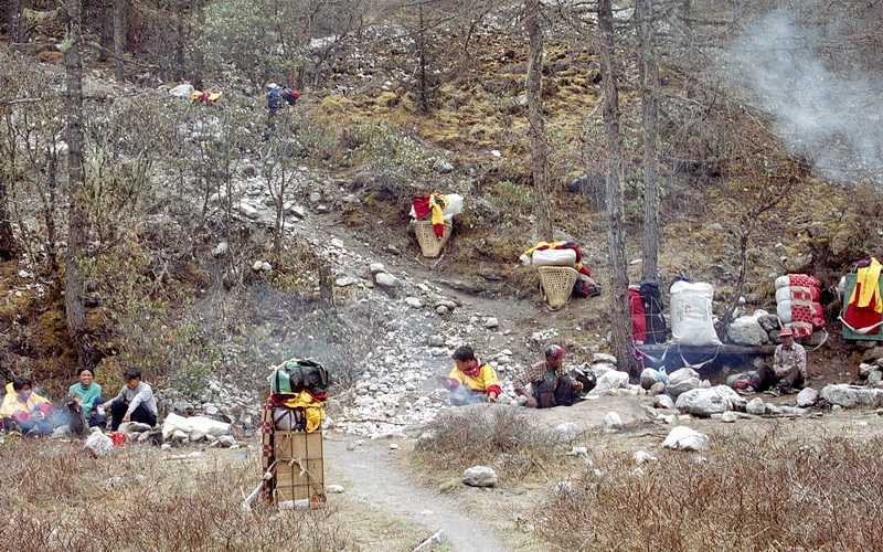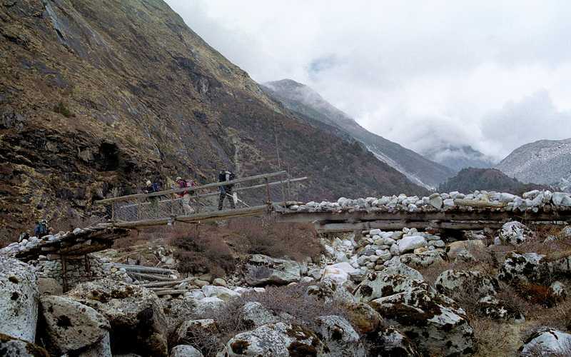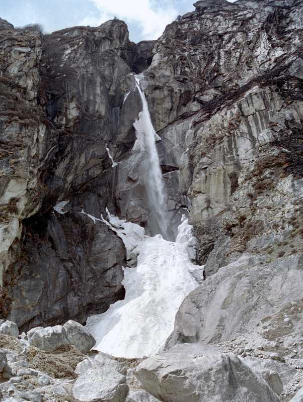 16.04.2003 Alle Träger müssen wieder zurückgeholt werden. Bombale wird vorgeschickt, überlässt es aber uns, den Portern Bescheid zu geben, ja so ist unser Bomberle. Aber ansonsten ein guter Kerl. Mietzi und ich laufen noch bis auf 4100 m zum Pass vor Lakep/ Kambachen, wo der Jannu-Blick uns allerdings von dicken Wolken verwehrt wird. Wieder zurück zum Zelt auf die Rampuk Kharka (3800 m). Hier gibt es malerische Weiden, durchsetzt mit vielen Bäumen, großen Felsen, oberhalb des Zeltplatzes ein herrlicher Wasserfall mit Schnee und Eis. Blick auf den Jannu-Gletscher, alles sehr gewaltig. Abends Schneefall ca. 5 cm, alles ist vereist und verschneit. Im Schlafsack ist es aber schön warm im Vaude-Schlafzelt. Erstmals auch Verteilung der Wärmflaschen, ist aber nichts für mich. Nachts zum Pinkeln raus, mit Schlafsack „unten offen“.