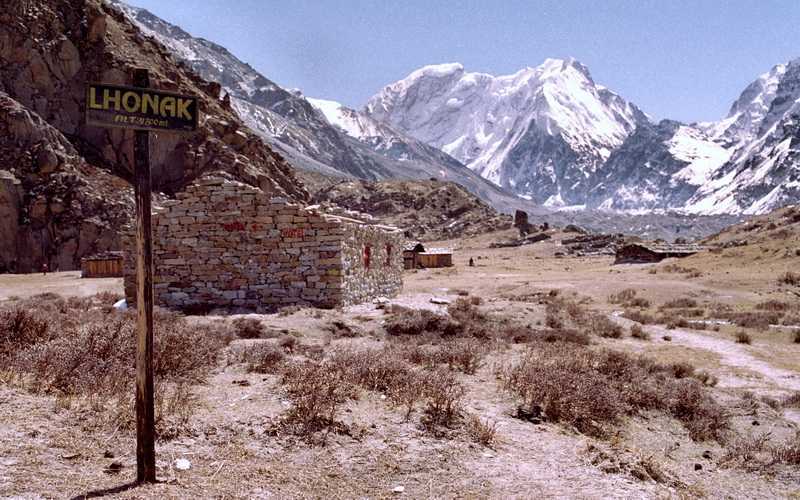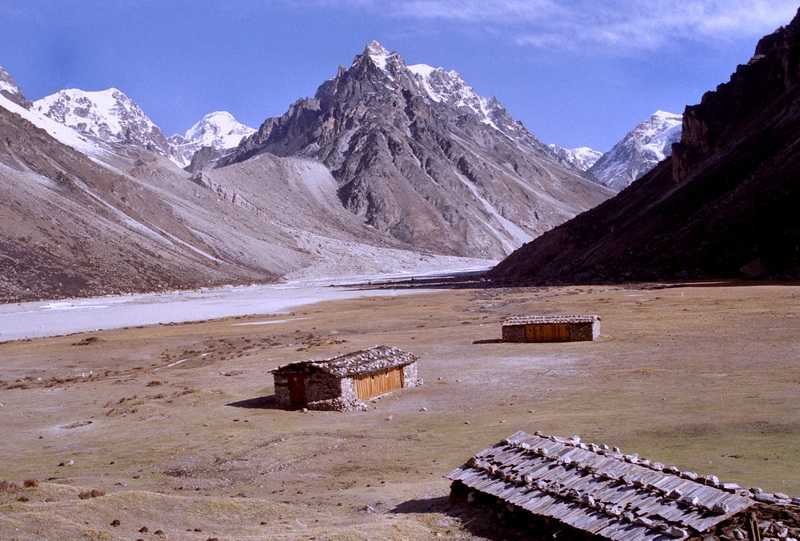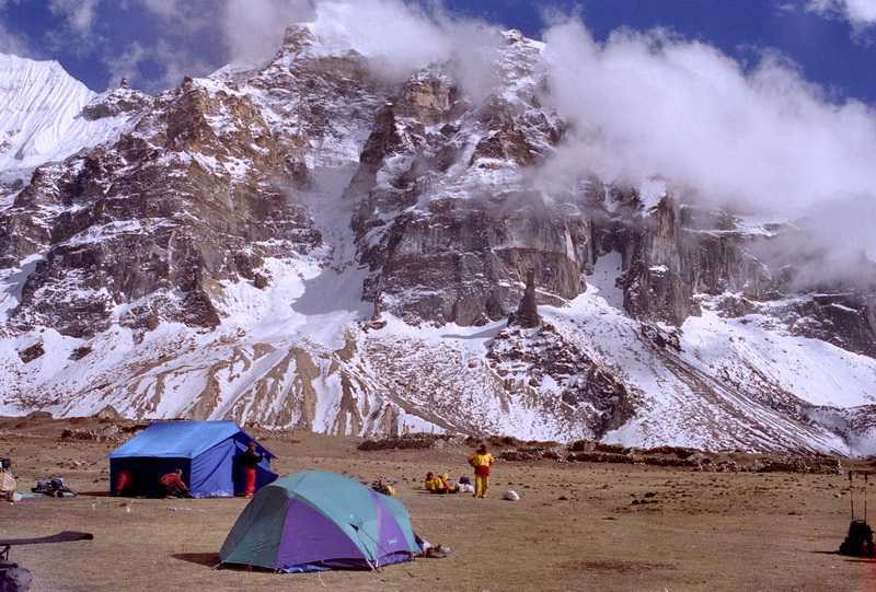 20.04.2003 Nach dem Lunch im strahlenden Sonnenschein ein Schnappschuss von den Profi-Bergsteigern mit guten Wünschen für den Gipfelsieg von mir. Abmarsch abwärts über die Hochebene von Lhonak. Trauriger Abschied vom Kangchendzönga, der auch bald in Wolken verschwindet. Herrlich gelegener Zeltplatz auf der riesigen Fläche unterhalb der Felsen. Nachts eisige Kälte in Lhonak (4700 m). Luftdruck im Pangpema Basislager = 532 mbar, das entspricht 50 % Sauerstoffgehalt (vergl. Chemnitz 315 m = 990 bis 1030 mbar). + 210 / - 210 m in 1:15 Std. o. Pause (Bergtour)
