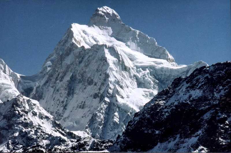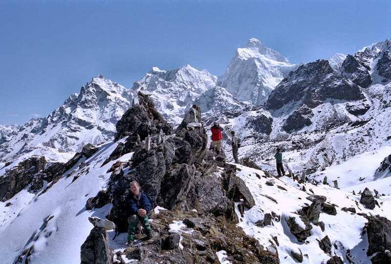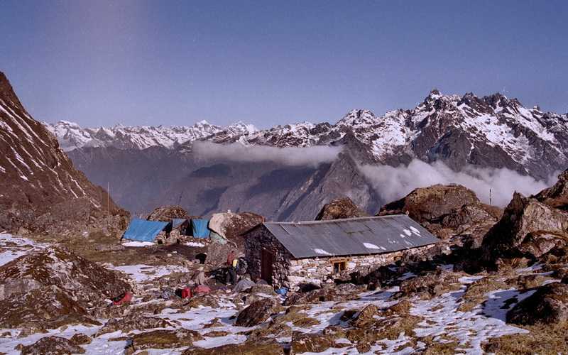 23.04.2003 Ein Träger hatte gestern seine Sonnenbrille nicht aufgesetzt, obwohl Niru ihn darauf hinwies. Heute ist er schneeblind und muss von Niru geführt werden. Ein anderer liegt abends gekrümmt vor Schmerzen in der Logde aus demselben Grund, keine Schutzbrille getragen. Beim steilen Abstieg bleiben vor allem die Träger mit ihren schweren Lasten bis zu den Hüften in den Schneemassen stecken, müssen sich immer wieder mühsam herauswühlen, teilweise bis zur völligen Erschöpfung. Die Führer und selbst einige von uns übernehmen Teile ihrer Lasten. Gemeinsam überwinden wir auch diese gefährliche Hürde, kommen endlich nach 800 m Abstieg, zuletzt ohne Schnee, durch Mooswald unten in Tseram (3870 m) auf der Zeltwiese der Lodge an, gelegen am Simbuwa Khola Fluss. Nachts wieder Frost und klarer Sternenhimmel.